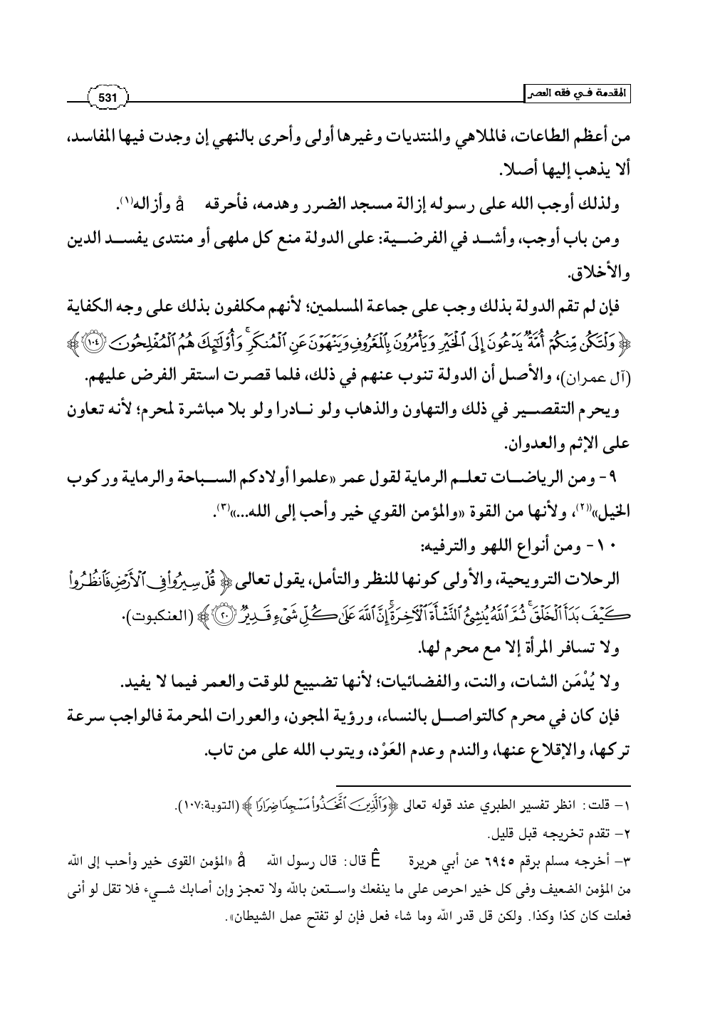 9 - ومن الرياضات تعلم الرماية لقول عمر «علموا أولادكم السباحة والرماية وركوب الخيل» (¬2)، ولأنها من القوة «والمؤمن القوي خير وأحب إلى الله ... » (¬3).