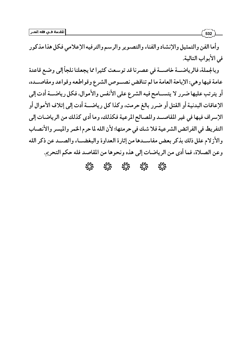 وبالجملة، فالرياضة خاصة في عصرنا قد توسعت كثيرا مما يجعلنا نلجأ إلى وضع قاعدة عامة فيها وهي: الإباحة العامة ما لم تناقض نصوص الشرع وقواطعه وقواعد ومقاصده، أو يترتب عليها ضرر لا يتسامح فيه الشرع على الأنفس والأموال، فكل رياضة أدت إلى الإعاقات البدنية أو القتل أو ضرر بالغ حرمت، وكذا كل رياضة أدت إلى إتلاف الأموال أو الإسراف فيها في غير المقاصد والمصالح المرعية فكذلك، وما أدى كذلك من الرياضات إلى التفريط في الفرائض الشرعية فلا شك في حرمتها؛ لأن الله لما حرم الخمر والميسر والأنصاب والأزلام علل ذلك بذكر بعض مفاسدها من إثارة العداوة والبغضاء والصد عن ذكر الله وعن الصلاة، فما أدى من الرياضات إلى هذه ونحوها من المقاصد فله حكم التحريم.