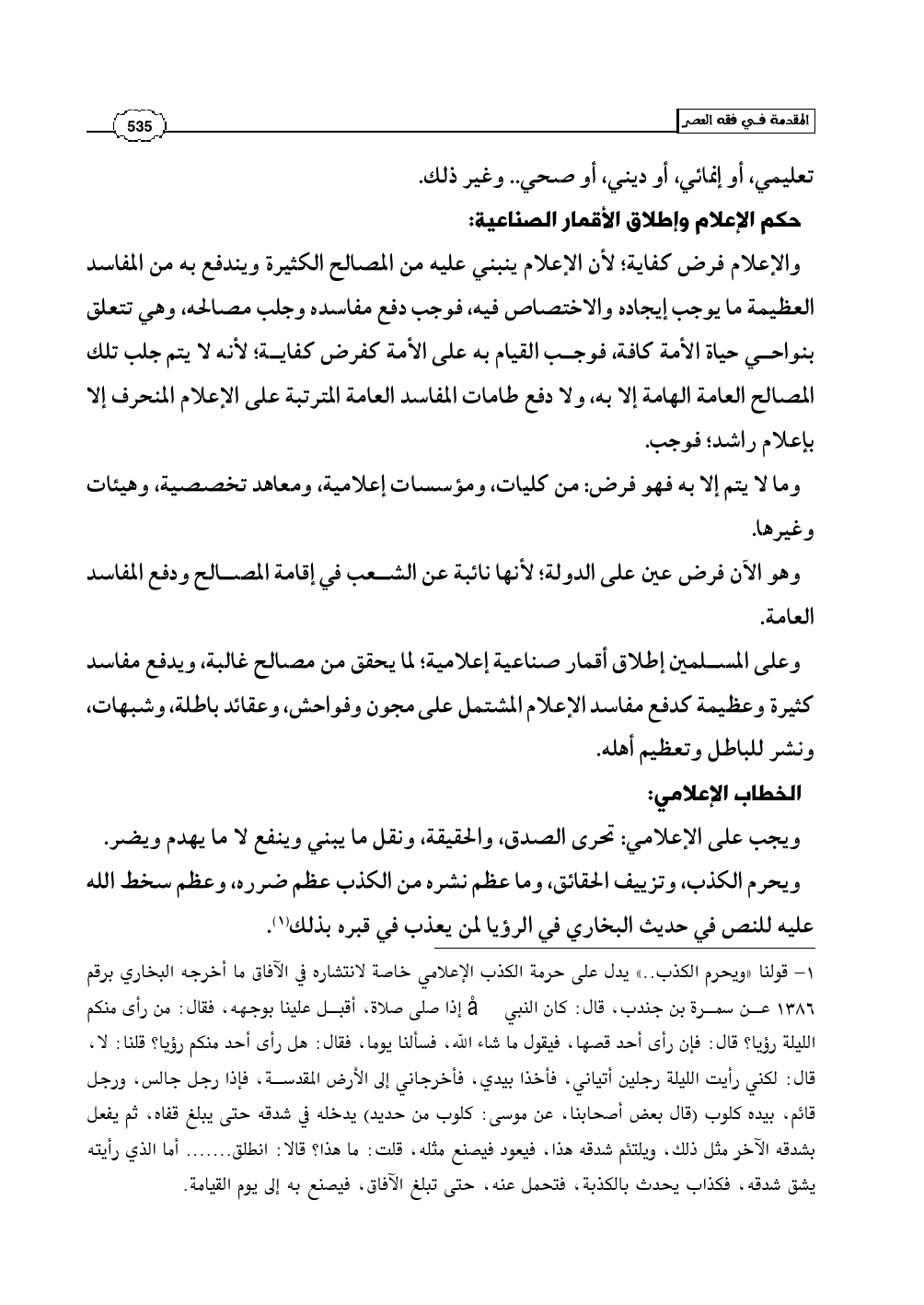 (¬1) - قولنا «ويحرم الكذب .. » يدل على حرمة الكذب الإعلامي خاصة لانتشاره في الآفاق ما أخرجه البخاري برقم 1386 عن سمرة بن جندب، قال: كان النبي صلى الله عليه وسلم إذا صلى صلاة، أقبل علينا بوجهه، فقال: من رأى منكم الليلة رؤيا؟ قال: فإن رأى أحد قصها، فيقول ما شاء الله، فسألنا يوما، فقال: هل رأى أحد منكم رؤيا؟ قلنا: لا، قال: لكني رأيت الليلة رجلين أتياني، فأخذا بيدي، فأخرجاني إلى الأرض المقدسة، فإذا رجل جالس، ورجل قائم، بيده كلوب (قال بعض أصحابنا، عن موسى: كلوب من حديد) يدخله في شدقه حتى يبلغ قفاه، ثم يفعل بشدقه الآخر مثل ذلك، ويلتئم شدقه هذا، فيعود فيصنع مثله، قلت: ما هذا؟ قالا: انطلق ....... أما الذي رأيته يشق شدقه، فكذاب يحدث بالكذبة، فتحمل عنه، حتى تبلغ الآفاق، فيصنع به إلى يوم القيامة.