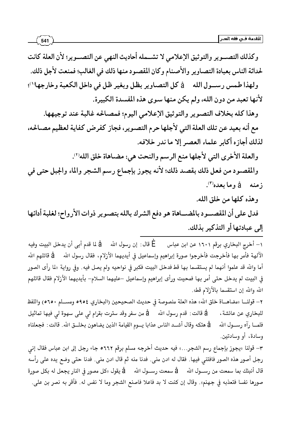 وكذلك التصوير والتوثيق الإعلامي لا تشمله أحاديث النهي عن التصوير؛ لأن العلة كانت لحداثة الناس بعبادة التصاوير والأصنام وكان المقصود منها ذلك في الغالب؛ فمنعت لأجل ذلك.