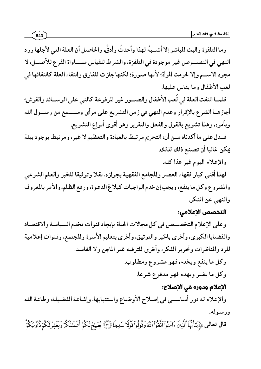 وما التلفزة والبث المباشر إلا أشبهُ لهذا وأحدثُ وأدقَّ، والحاصل أن العلة التي لأجلها ورد النهي في النصوص غير موجودة في التلفزة، والشرط للقياس مساواة الفرع للأصل، لا مجرد الاسم وإلا لحرمت المرآة؛ لأنها صورة؛ لكنها جازت للفارق وانتفاء العلة كانتفائها في لعب الأطفال وما يقاس عليها.