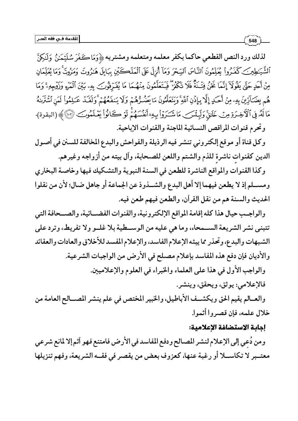 لذلك ورد النص القطعي حاكما بكفر معلمه ومتعلمه ومشتريه (وَمَا كَفَرَ سُلَيْمَانُ وَلَكِنَّ الشَّيْاطِينَ كَفَرُوا يُعَلِّمُونَ النَّاسَ السِّحْرَ وَمَا أُنزِلَ عَلَى الْمَلَكَيْنِ بِبَابِلَ هَارُوتَ وَمَارُوتَ وَمَا يُعَلِّمَانِ مِنْ أَحَدٍ حَتَّى يَقُولاَ إِنَّمَا نَحْنُ فِتْنَةٌ فَلاَ تَكْفُرْ فَيَتَعَلَّمُونَ مِنْهُمَا مَا يُفَرِّقُونَ بِهِ بَيْنَ الْمَرْءِ وَزَوْجِهِ وَمَا هُم بِضَآرِّينَ بِهِ مِنْ أَحَدٍ إِلاَّ بِإِذْنِ اللَّهِ وَيَتَعَلَّمُونَ مَا يَضُرُّهُمْ وَلاَ يَنفَعُهُمْ وَلَقَدْ عَلِمُوا لَمَنِ اشْتَرَاهُ مَا لَهُ فِي الآخِرَةِ مِنْ خَلاَقٍ وَلَبِئْسَ مَا شَرَوْا بِهِ أَنفُسَهُمْ لَوْ كَانُوا يَعْلَمُونَ) (البقرة: 102).