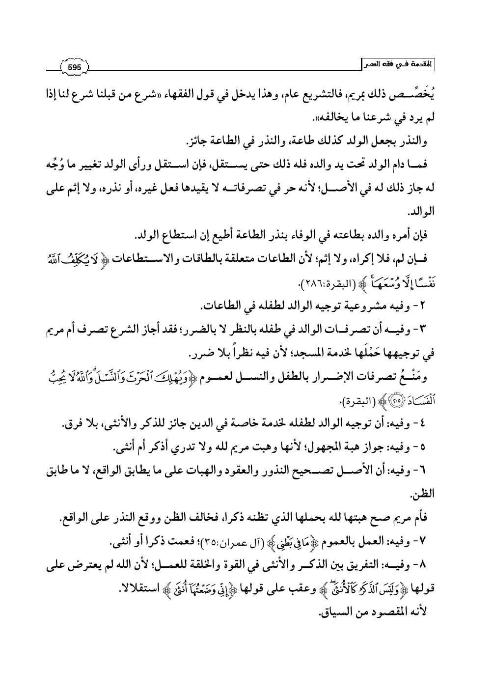 3 - وفيه أن تصرفات الوالد في طفله بالنظر لا بالضرر؛ فقد أجاز الشرع تصرف أم مريم في توجيهها حَمْلَها لخدمة المسجد؛ لأن فيه نظراً بلا ضرر.