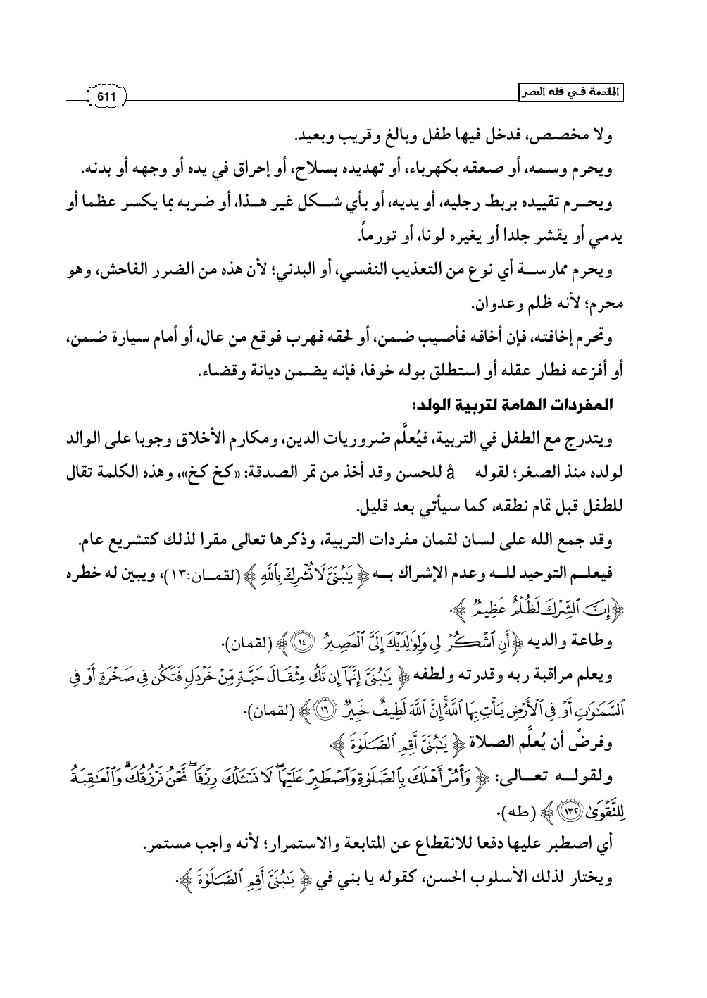 ويتدرج مع الطفل في التربية، فيُعلَّم ضروريات الدين، ومكارم الأخلاق وجوبا على الوالد لولده منذ الصغر؛ لقوله صلى الله عليه وسلم للحسن وقد أخذ من تمر الصدقة: «كخ كخ»، وهذه الكلمة تقال للطفل قبل تمام نطقه، كما سيأتي بعد قليل.