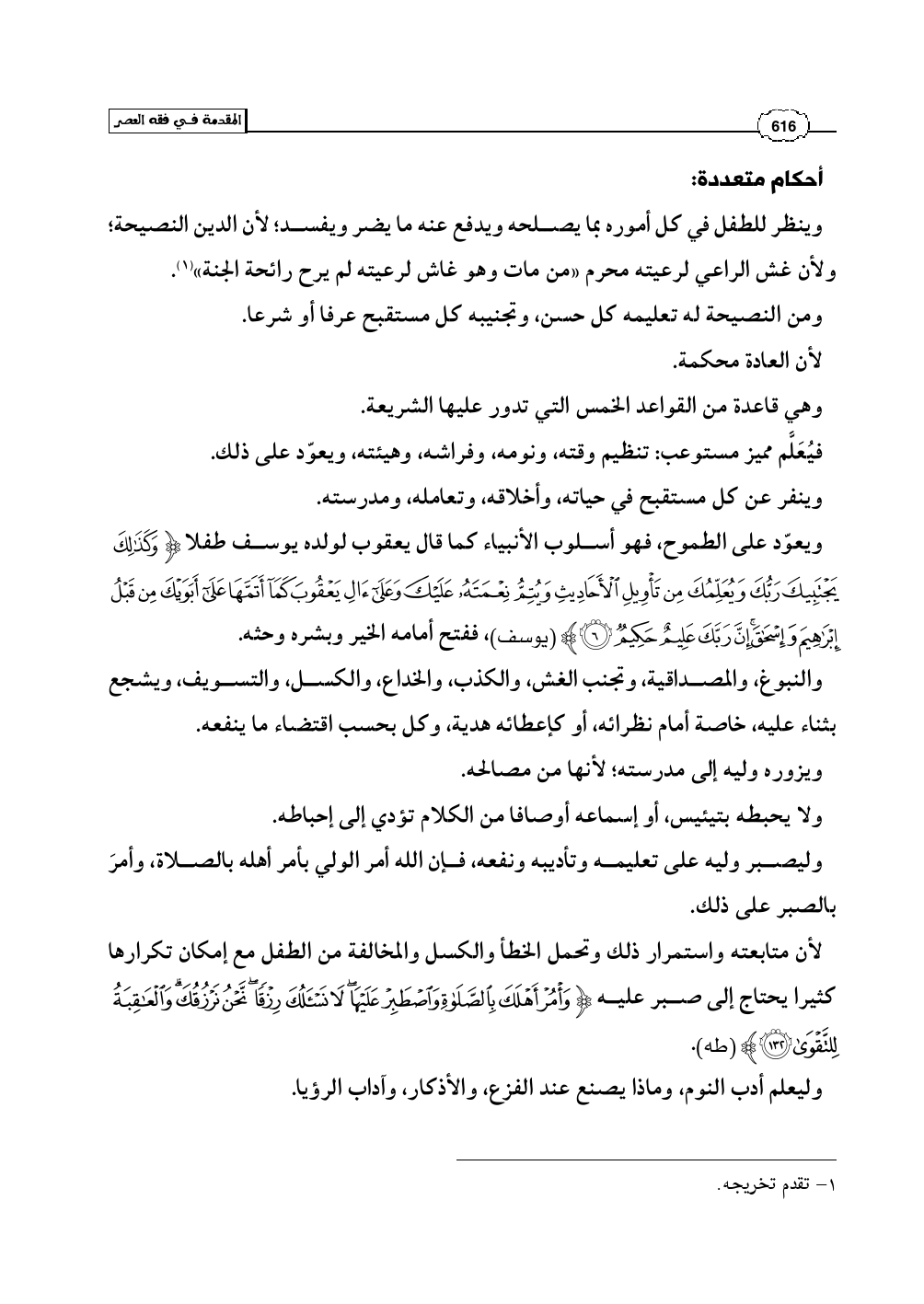 وينظر للطفل في كل أموره بما يصلحه ويدفع عنه ما يضر ويفسد؛ لأن الدين النصيحة؛ ولأن غش الراعي لرعيته محرم «من مات وهو غاش لرعيته لم يرح رائحة الجنة» (¬1).