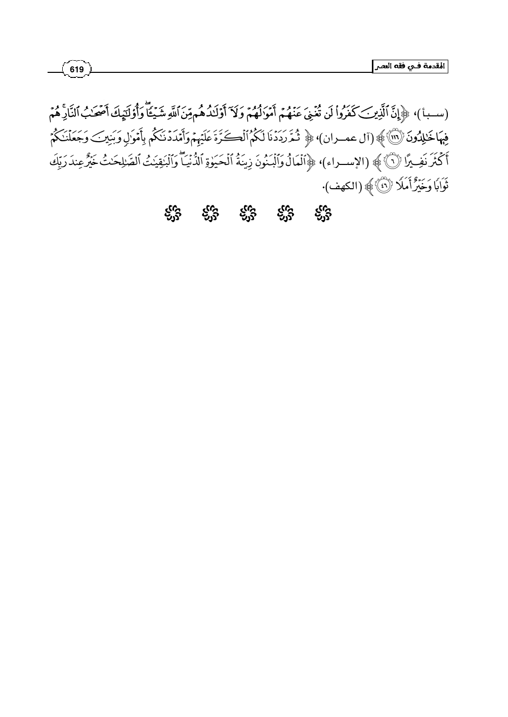 (سبأ: 37)، (إِنَّ الَّذِينَ كَفَرُوا لَن تُغْنِيَ عَنْهُمْ أَمْوَالُهُمْ وَلاَ أَوْلاَدُهُم مِّنَ اللَّهِ شَيْئًا وَأُوْلَئِكَ أَصْحَابُ النَّارِ هُمْ فِيهَا خَالِدُونَ) (آل عمران: 116)، (ثُمَّ رَدَدْنَا لَكُمُ الْكَرَّةَ عَلَيْهِمْ وَأَمْدَدْنَاكُم بِأَمْوَالٍ وَبَنِينَ وَجَعَلْنَاكُمْ أَكْثَرَ نَفِيرًا) (الإسراء: 6)، (الْمَالُ وَالْبَنُونَ زِينَةُ الْحَيَاةِ الدُّنْيَا وَالْبَاقِيَاتُ الصَّالِحَاتُ خَيْرٌ عِندَ رَبِّكَ ثَوَابًا وَخَيْرٌ أَمَلاً) (الكهف: 46).