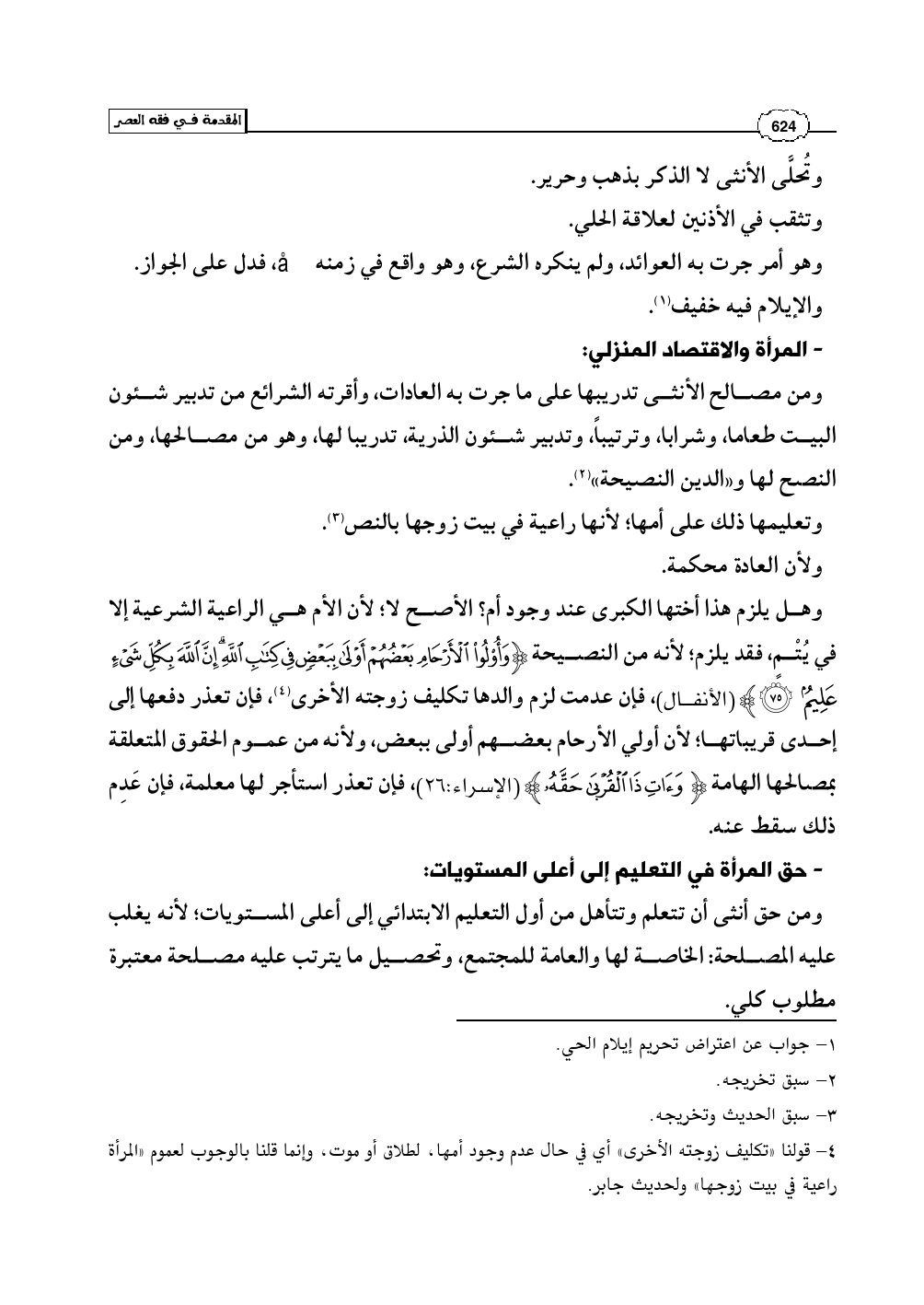 (¬4) - قولنا «تكليف زوجته الأخرى» أي في حال عدم وجود أمها، لطلاق أو موت، وإنما قلنا بالوجوب لعموم «المرأة راعية في بيت زوجها» ولحديث جابر.