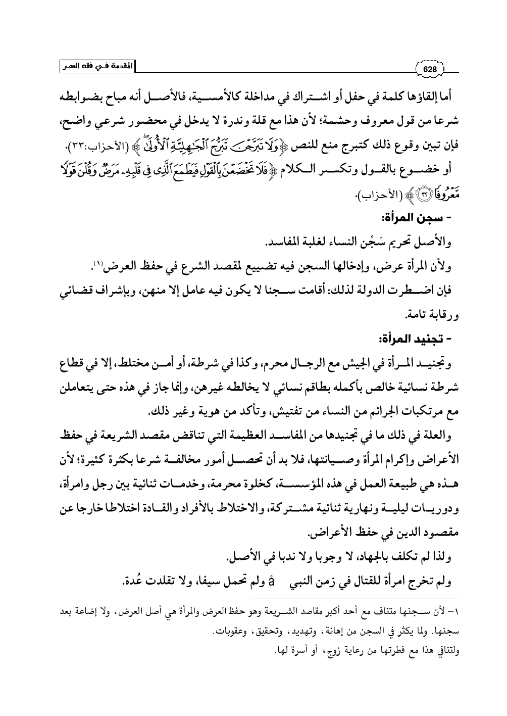 والعلة في ذلك ما في تجنيدها من المفاسد العظيمة التي تناقض مقصد الشريعة في حفظ الأعراض وإكرام المرأة وصيانتها، فلا بد أن تحصل أمور مخالفة شرعا بكثرة كثيرة؛ لأن هذه هي طبيعة العمل في هذه المؤسسة، كخلوة محرمة، وخدمات ثنائية بين رجل وامرأة، ودوريات ليلية ونهارية ثنائية مشتركة، والاختلاط بالأفراد والقادة اختلاطا خارجا عن مقصود الدين في حفظ الأعراض.