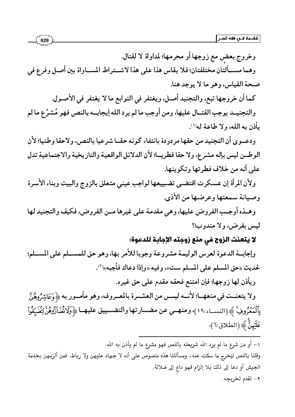 وقلنا بالنص ليخرج ما سكت عنه، ومسألتنا هذه منصوص على أنه لا جهاد عليهن ولا رباط، فمن ألزمهن بخدمة الجيش أو دعا إلى ذلك بلا إلزام فهو داعٍ إلى ضلالة.