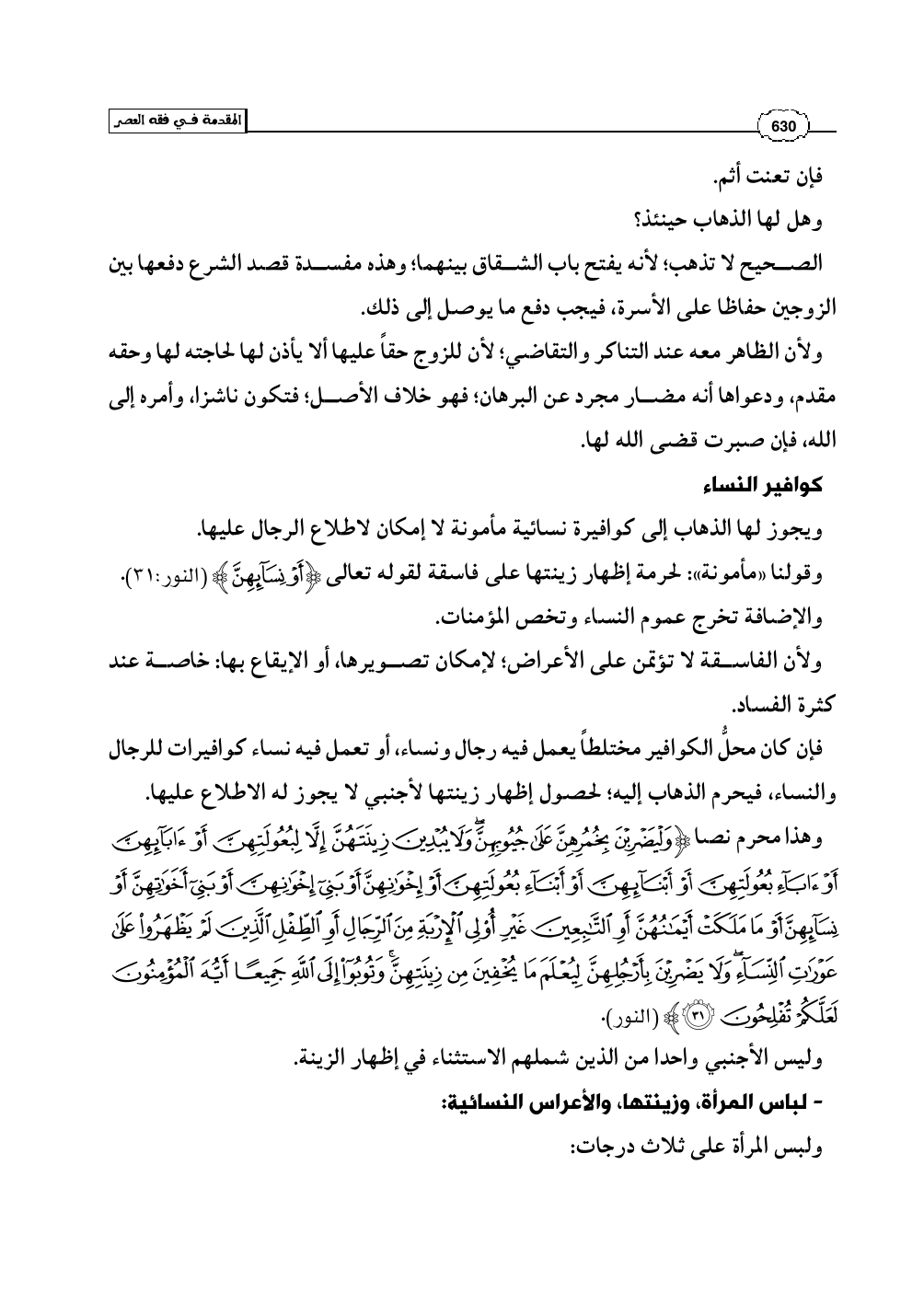 وهذا محرم نصا (وَلْيَضْرِبْنَ بِخُمُرِهِنَّ عَلَى جُيُوبِهِنَّ وَلا يُبْدِينَ زِينَتَهُنَّ إِلاَّ لِبُعُولَتِهِنَّ أَوْ آبَائِهِنَّ أَوْ آبَاء بُعُولَتِهِنَّ أَوْ أَبْنَائِهِنَّ أَوْ أَبْنَاء بُعُولَتِهِنَّ أَوْ إِخْوَانِهِنَّ أَوْ بَنِي إِخْوَانِهِنَّ أَوْ بَنِي أَخَوَاتِهِنَّ أَوْ نِسَائِهِنَّ أَوْ مَا مَلَكَتْ أَيْمَانُهُنَّ أَوِ التَّابِعِينَ غَيْرِ أُوْلِي الإِرْبَةِ مِنَ الرِّجَالِ أَوِ الطِّفْلِ الَّذِينَ لَمْ يَظْهَرُوا عَلَى عَوْرَاتِ النِّسَاء وَلا يَضْرِبْنَ بِأَرْجُلِهِنَّ لِيُعْلَمَ مَا يُخْفِينَ مِن زِينَتِهِنَّ وَتُوبُوا إِلَى اللَّهِ جَمِيعًا أَيُّهَا الْمُؤْمِنُونَ لَعَلَّكُمْ تُفْلِحُونَ) (النور: 31).