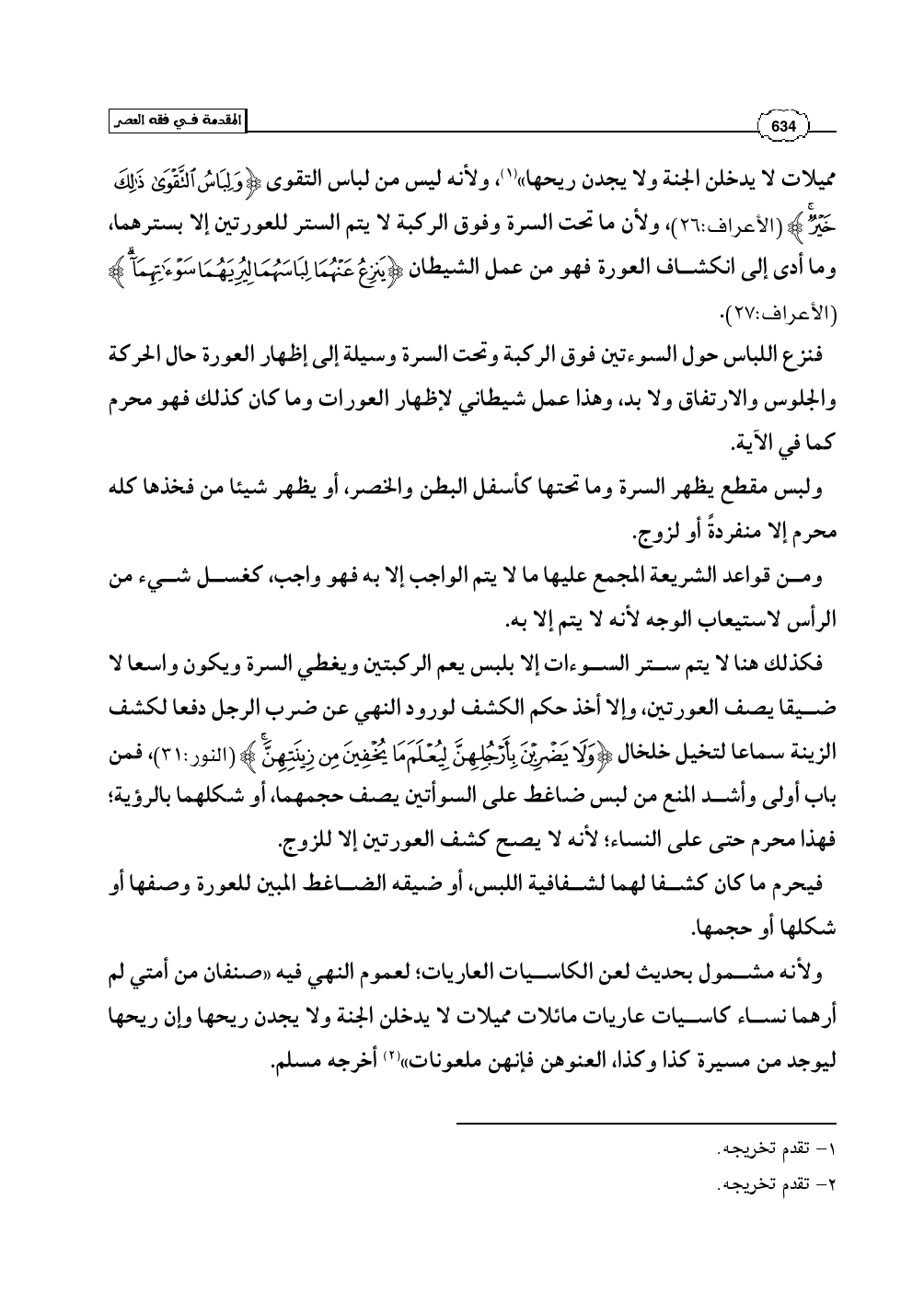 مميلات لا يدخلن الجنة ولا يجدن ريحها» (¬1)، ولأنه ليس من لباس التقوى (وَلِبَاسُ التَّقْوَىَ ذَلِكَ خَيْرٌ) (الأعراف: 26)، ولأن ما تحت السرة وفوق الركبة لا يتم الستر للعورتين إلا بسترهما، وما أدى إلى انكشاف العورة فهو من عمل الشيطان (يَنزِعُ عَنْهُمَا لِبَاسَهُمَا لِيُرِيَهُمَا سَوْآتِهِمَا) (الأعراف: 27).