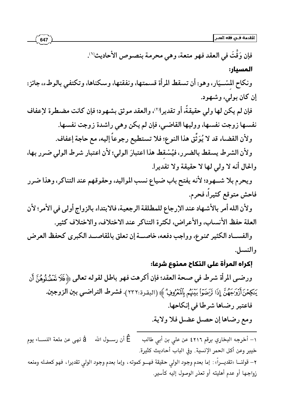 ونكاح المِسْيَار، وهو: أن تسقط المرأة قسمتها، ونفقتها، وسكناها، وتكتفي بالوطء، جائز: إن كان بولي، وشهود.