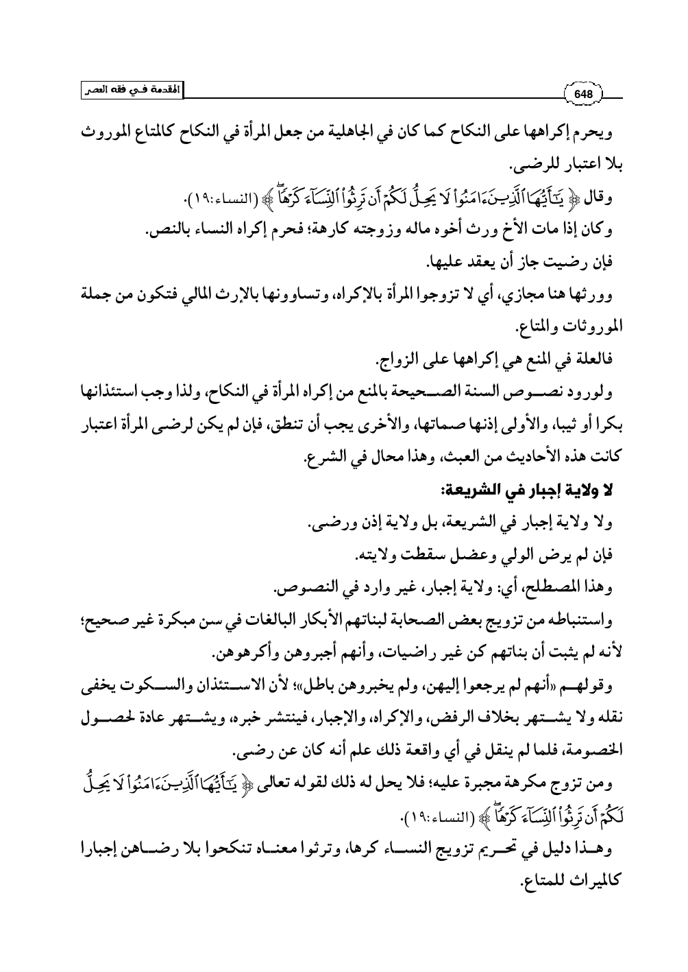 وقال (يَا أَيُّهَا الَّذِينَ آمَنُوا لاَ يَحِلُّ لَكُمْ أَن تَرِثُوا النِّسَاء كَرْهًا) (النساء: 19).