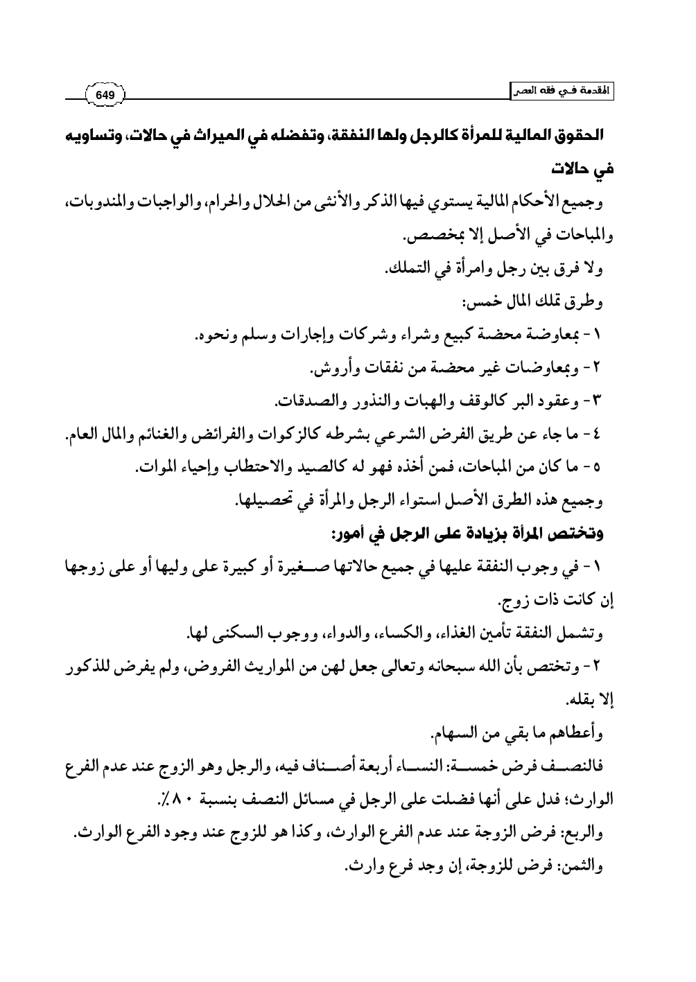 وجميع الأحكام المالية يستوي فيها الذكر والأنثى من الحلال والحرام، والواجبات والمندوبات، والمباحات في الأصل إلا بمخصص.