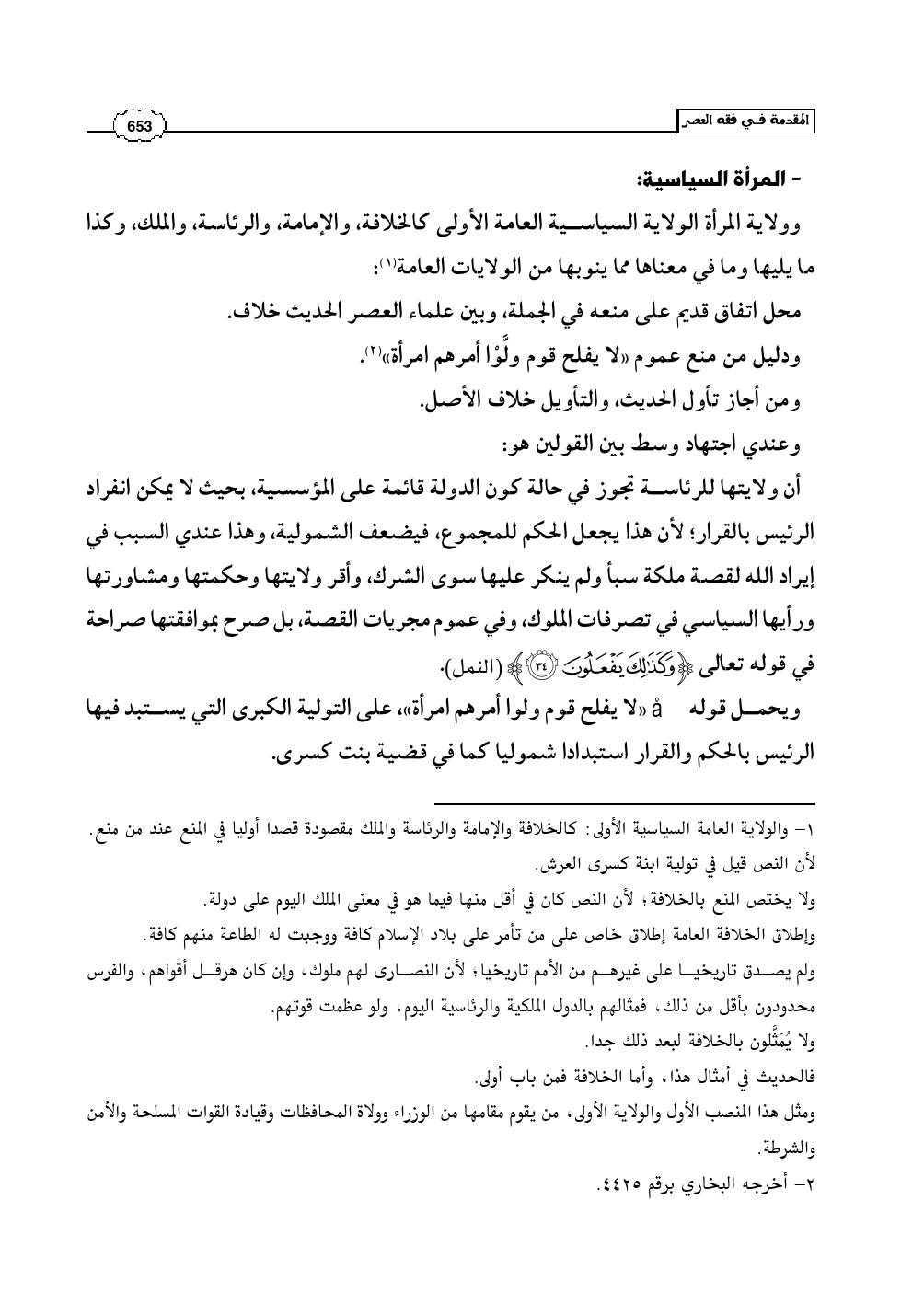 ويحمل قوله صلى الله عليه وسلم «لا يفلح قوم ولوا أمرهم امرأة»، على التولية الكبرى التي يستبد فيها الرئيس بالحكم والقرار استبدادا شموليا كما في قضية بنت كسرى.