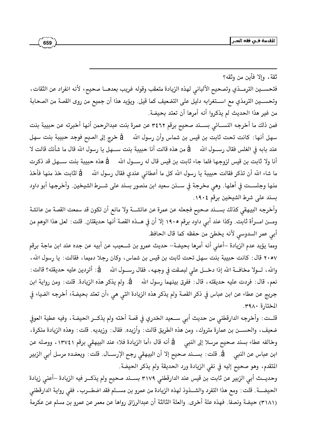 ومما يؤيد عدم الزيادة -أعني أنه أمرها بحيضة- حديث عمرو بن شعيب عن أبيه عن جده عند ابن ماجة برقم 2057 قال: كانت حبيبة بنت سهل تحت ثابت بن قيس بن شماس، وكان رجلا دميما، فقالت: يا رسول الله، والله، لولا مخافة الله إذا دخل علي لبصقت في وجهه، فقال رسول الله صلى الله عليه وسلم: أتردين عليه حديقته؟ قالت: نعم، قال: فردت عليه حديقته، قال: ففرق بينهما رسول الله صلى الله عليه وسلم. ولم يذكر هذه الزيادة. قلت: ومن رواية ابن جريج عن عطاء عن ابن عباس في ذكر القصة ولم يذكر هذه الزيادة التي هي «أن تعتد بحيضة» أخرجه الضياء في المختارة 3980.