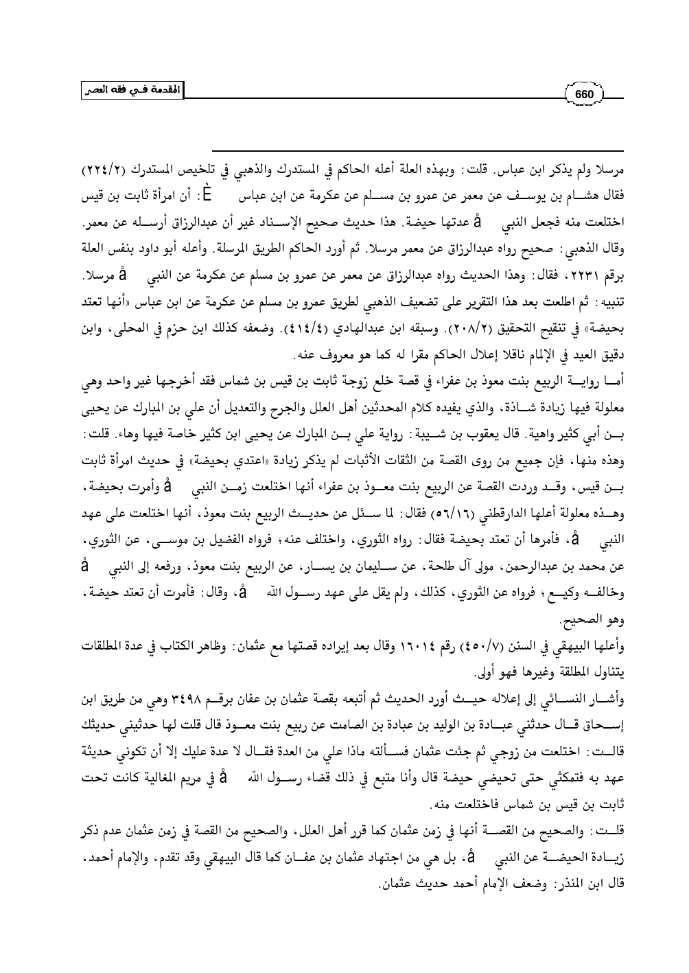 = مرسلا ولم يذكر ابن عباس. قلت: وبهذه العلة أعله الحاكم في المستدرك والذهبي في تلخيص المستدرك (2/ 224) فقال هشام بن يوسف عن معمر عن عمرو بن مسلم عن عكرمة عن ابن عباس رضي الله عنهما: أن امرأة ثابت بن قيس اختلعت منه فجعل النبي صلى الله عليه وسلم عدتها حيضة. هذا حديث صحيح الإسناد غير أن عبدالرزاق أرسله عن معمر. وقال الذهبي: صحيح رواه عبدالرزاق عن معمر مرسلا. ثم أورد الحاكم الطريق المرسلة. وأعله أبو داود بنفس العلة برقم 2231، فقال: وهذا الحديث رواه عبدالرزاق عن معمر عن عمرو بن مسلم عن عكرمة عن النبي صلى الله عليه وسلم مرسلا. تنبيه: ثم اطلعت بعد هذا التقرير على تضعيف الذهبي لطريق عمرو بن مسلم عن عكرمة عن ابن عباس «أنها تعتد بحيضة» في تنقيح التحقيق (2/ 208). وسبقه ابن عبدالهادي (4/ 414). وضعفه كذلك ابن حزم في المحلى، وابن دقيق العيد في الإلمام ناقلا إعلال الحاكم مقرا له كما هو معروف عنه.