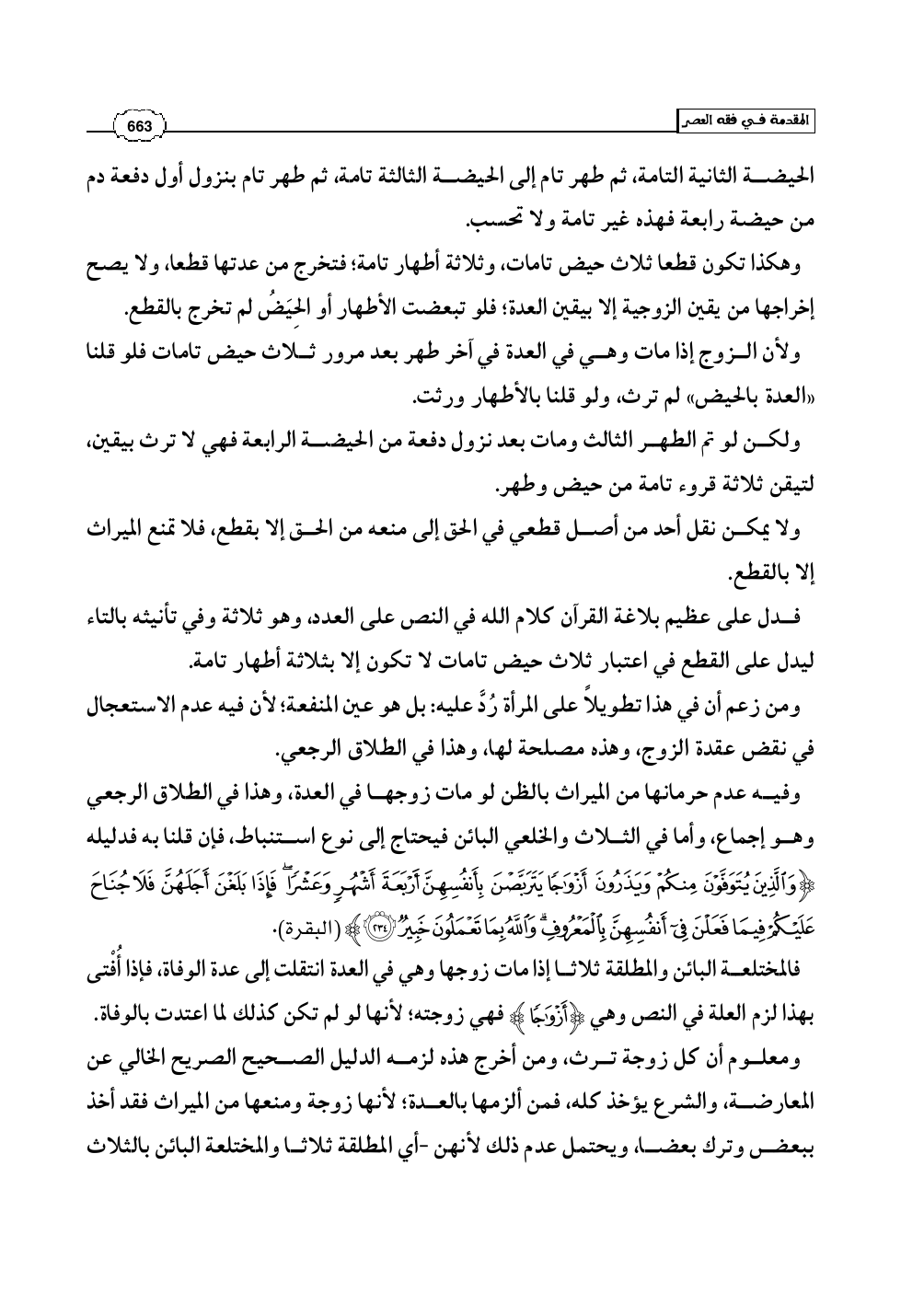 ومعلوم أن كل زوجة ترث، ومن أخرج هذه لزمه الدليل الصحيح الصريح الخالي عن المعارضة، والشرع يؤخذ كله، فمن ألزمها بالعدة؛ لأنها زوجة ومنعها من الميراث فقد أخذ ببعض وترك بعضا، ويحتمل عدم ذلك لأنهن -أي المطلقة ثلاثا والمختلعة البائن بالثلاث