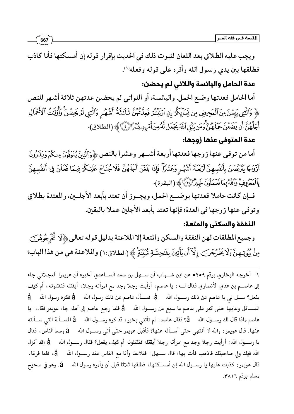 (¬1) - أخرجه البخاري برقم 5259 عن ابن شهاب أن سهل بن سعد الساعدي أخبره أن عويمرا العجلاني جاء إلى عاصم بن عدي الأنصاري فقال له: يا عاصم، أرأيت رجلا وجد مع امرأته رجلا، أيقتله فتقتلونه، أم كيف يفعل؟ سل لي يا عاصم عن ذلك رسول الله صلى الله عليه وسلم. فسأل عاصم عن ذلك رسول الله صلى الله عليه وسلم فكره رسول الله صلى الله عليه وسلم المسائل وعابها حتى كبر على عاصم ما سمع من رسول الله صلى الله عليه وسلم فلما رجع عاصم إلى أهله جاء عويمر فقال: يا عاصم ماذا قال لك رسول الله صلى الله عليه وسلم؟ فقال عاصم: لم تأتني بخير، قد كره رسول الله صلى الله عليه وسلم المسألة التي سألته عنها. قال عويمر: والله لا أنتهي حتى أسأله عنها؟ فأقبل عويمر حتى أتى رسول الله صلى الله عليه وسلم وسط الناس، فقال يا رسول الله: أرأيت رجلا وجد مع امرأته رجلا أيقتله فتقتلونه أم كيف يفعل؟ فقال رسول الله صلى الله عليه وسلم «قد أنزل الله فيك وفي صاحبتك فاذهب فأت بها» قال سهل: فتلاعنا وأنا مع الناس عند رسول الله صلى الله عليه وسلم، فلما فرغا، قال عويمر: كذبت عليها يا رسول الله إن أمسكتها، فطلقها ثلاثا قبل أن يأمره رسول الله صلى الله عليه وسلم. وهو في صحيح مسلم برقم 3816.