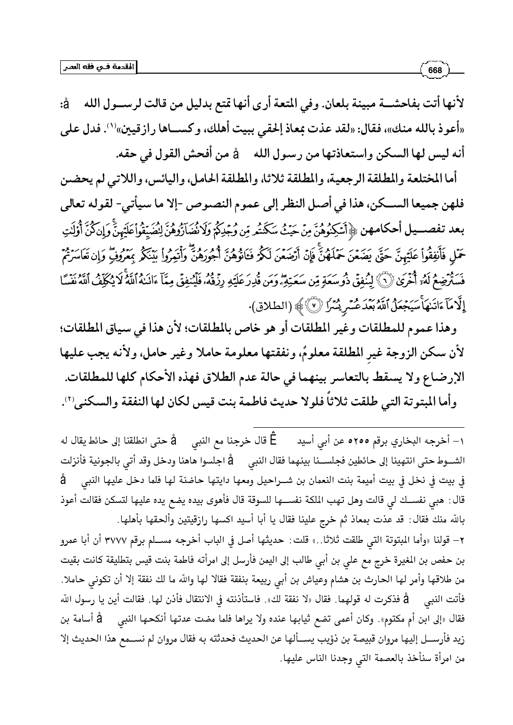 (¬2) - قولنا «وأما المبتوتة التي طلقت ثلاثا .. » قلت: حديثها أصل في الباب أخرجه مسلم برقم 3777 أن أبا عمرو بن حفص بن المغيرة خرج مع علي بن أبي طالب إلى اليمن فأرسل إلى امرأته فاطمة بنت قيس بتطليقة كانت بقيت من طلاقها وأمر لها الحارث بن هشام وعياش بن أبي ربيعة بنفقة فقالا لها والله ما لك نفقة إلا أن تكوني حاملا. فأتت النبي صلى الله عليه وسلم فذكرت له قولهما. فقال «لا نفقة لك». فاستأذنته في الانتقال فأذن لها. فقالت أين يا رسول الله فقال «إلى ابن أم مكتوم». وكان أعمى تضع ثيابها عنده ولا يراها فلما مضت عدتها أنكحها النبي صلى الله عليه وسلم أسامة بن زيد فأرسل إليها مروان قبيصة بن ذؤيب يسألها عن الحديث فحدثته به فقال مروان لم نسمع هذا الحديث إلا من امرأة سنأخذ بالعصمة التي وجدنا الناس عليها. =