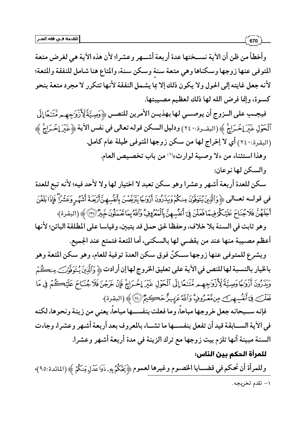 وأخطأ من ظن أن الآية نسختها عدة أربعة أشهر وعشرا؛ لأن هذه الآية هي لغرض متعة المتوفى عنها زوجها وسكناها وهي متعة سنةٍ وسكن سنة، والمتاع هنا شامل للنفقة والمتعة؛ لأنه جعل غايته إلى الحول ولا يكون ذلك إلا بما يشمل النفقة لأنها تتكرر لا مجرد متعة بنحو كسوة، وإنما فرض الله لها ذلك لعظيم مصيبتها.