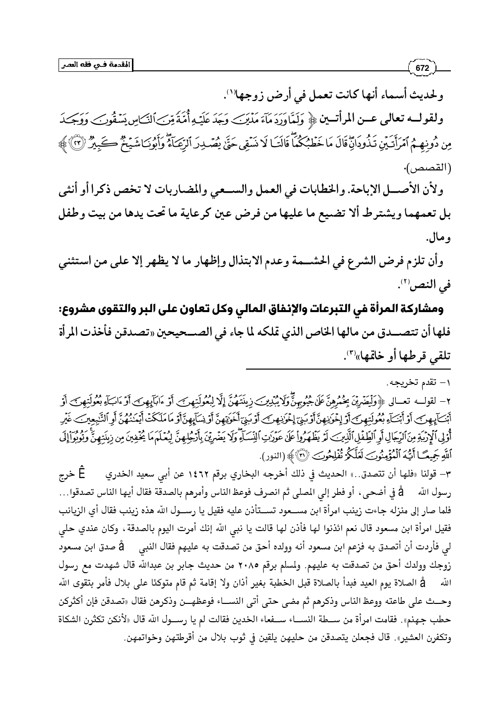 (¬3) - قولنا «فلها أن تتصدق .. » الحديث في ذلك أخرجه البخاري برقم 1462 عن أبي سعيد الخدري رضي الله عنه خرج رسول الله صلى الله عليه وسلم في أضحى، أو فطر إلي المصلى ثم انصرف فوعظ الناس وأمرهم بالصدقة فقال أيها الناس تصدقوا ... فلما صار إلى منزله جاءت زينب امرأة ابن مسعود تستأذن عليه فقيل يا رسول الله هذه زينب فقال أي الزيانب فقيل امرأة ابن مسعود قال نعم ائذنوا لها فأذن لها قالت يا نبي الله إنك أمرت اليوم بالصدقة، وكان عندي حلي لي فأردت أن أتصدق به فزعم ابن مسعود أنه وولده أحق من تصدقت به عليهم فقال النبي صلى الله عليه وسلم صدق ابن مسعود زوجك وولدك أحق من تصدقت به عليهم. ولمسلم برقم 2085 من حديث جابر بن عبدالله قال شهدت مع رسول الله صلى الله عليه وسلم الصلاة يوم العيد فبدأ بالصلاة قبل الخطبة بغير أذان ولا إقامة ثم قام متوكئا على بلال فأمر بتقوى الله وحث على طاعته ووعظ الناس وذكرهم ثم مضى حتى أتى النساء فوعظهن وذكرهن فقال «تصدقن فإن أكثركن حطب جهنم». فقامت امرأة من سطة النساء سفعاء الخدين فقالت لم يا رسول الله قال «لأنكن تكثرن الشكاة وتكفرن العشير». قال فجعلن يتصدقن من حليهن يلقين في ثوب بلال من أقرطتهن وخواتمهن.
