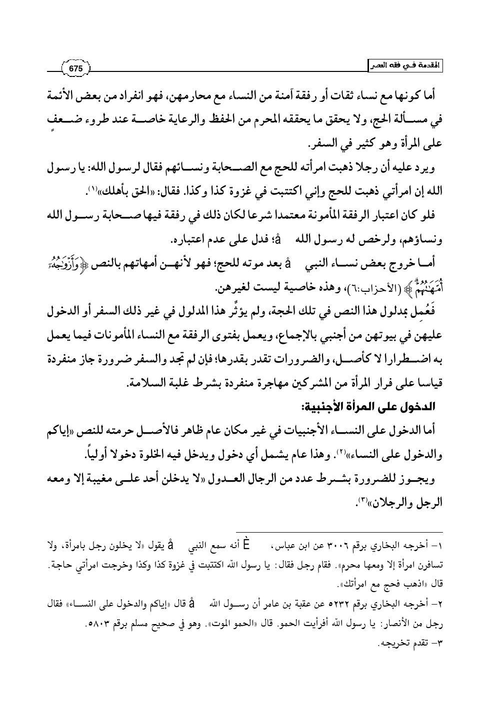 فَعُمِل بمدلول هذا النص في تلك الحجة، ولم يؤثِّر هذا المدلول في غير ذلك السفر أو الدخول عليهن في بيوتهن من أجنبي بالإجماع، ويعمل بفتوى الرفقة مع النساء المأمونات فيما يعمل به اضطرارا لا كأصل، والضرورات تقدر بقدرها؛ فإن لم تجد والسفر ضرورة جاز منفردة قياسا على فرار المرأة من المشركين مهاجرة منفردة بشرط غلبة السلامة.
