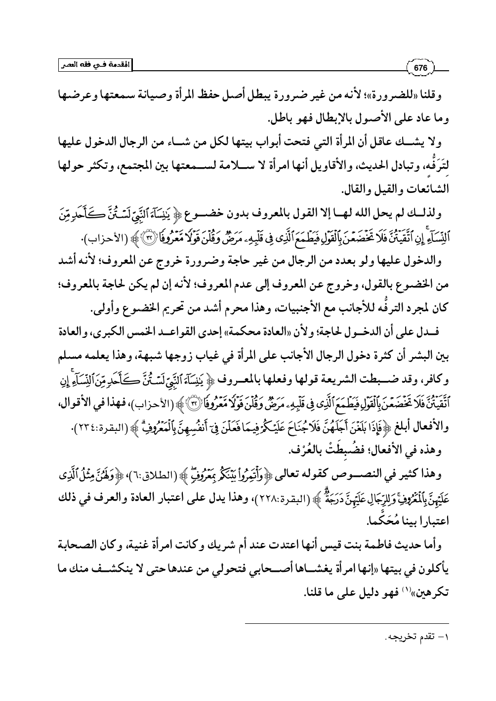 وقلنا «للضرورة»؛ لأنه من غير ضرورة يبطل أصل حفظ المرأة وصيانة سمعتها وعرضها وما عاد على الأصول بالإبطال فهو باطل.