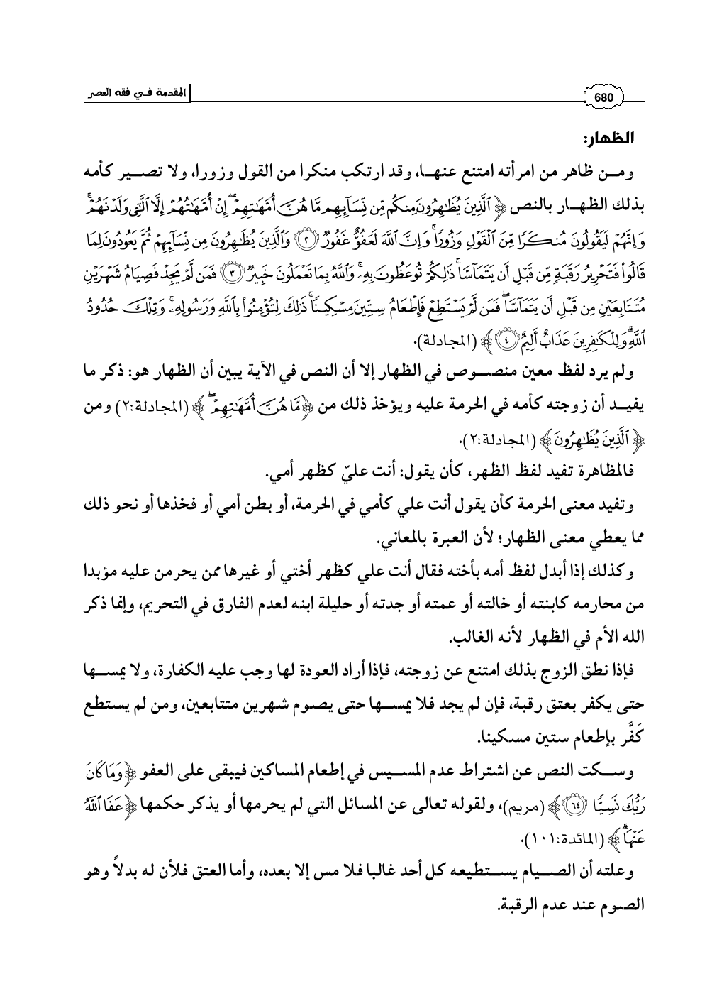 ومن ظاهر من امرأته امتنع عنها، وقد ارتكب منكرا من القول وزورا، ولا تصير كأمه بذلك الظهار بالنص (الَّذِينَ يُظَاهِرُونَ مِنكُم مِّن نِّسَائِهِم مَّا هُنَّ أُمَّهَاتِهِمْ إِنْ أُمَّهَاتُهُمْ إِلاَّ اللاَّئِي وَلَدْنَهُمْ وَإِنَّهُمْ لَيَقُولُونَ مُنكَرًا مِّنَ الْقَوْلِ وَزُورًا وَإِنَّ اللَّهَ لَعَفُوٌّ غَفُورٌ* وَالَّذِينَ يُظَاهِرُونَ مِن نِّسَائِهِمْ ثُمَّ يَعُودُونَ لِمَا قَالُوا فَتَحْرِيرُ رَقَبَةٍ مِّن قَبْلِ أَن يَتَمَاسَّا ذَلِكُمْ تُوعَظُونَ بِهِ وَاللَّهُ بِمَا تَعْمَلُونَ خَبِيرٌ* فَمَن لَّمْ يَجِدْ فَصِيَامُ شَهْرَيْنِ مُتَتَابِعَيْنِ مِن قَبْلِ أَن يَتَمَاسَّا فَمَن لَّمْ يَسْتَطِعْ فَإِطْعَامُ سِتِّينَ مِسْكِينًا ذَلِكَ لِتُؤْمِنُوا بِاللَّهِ وَرَسُولِهِ وَتِلْكَ حُدُودُ اللَّهِ وَلِلْكَافِرِينَ عَذَابٌ أَلِيمٌ) (المجادلة: 2 - 4).