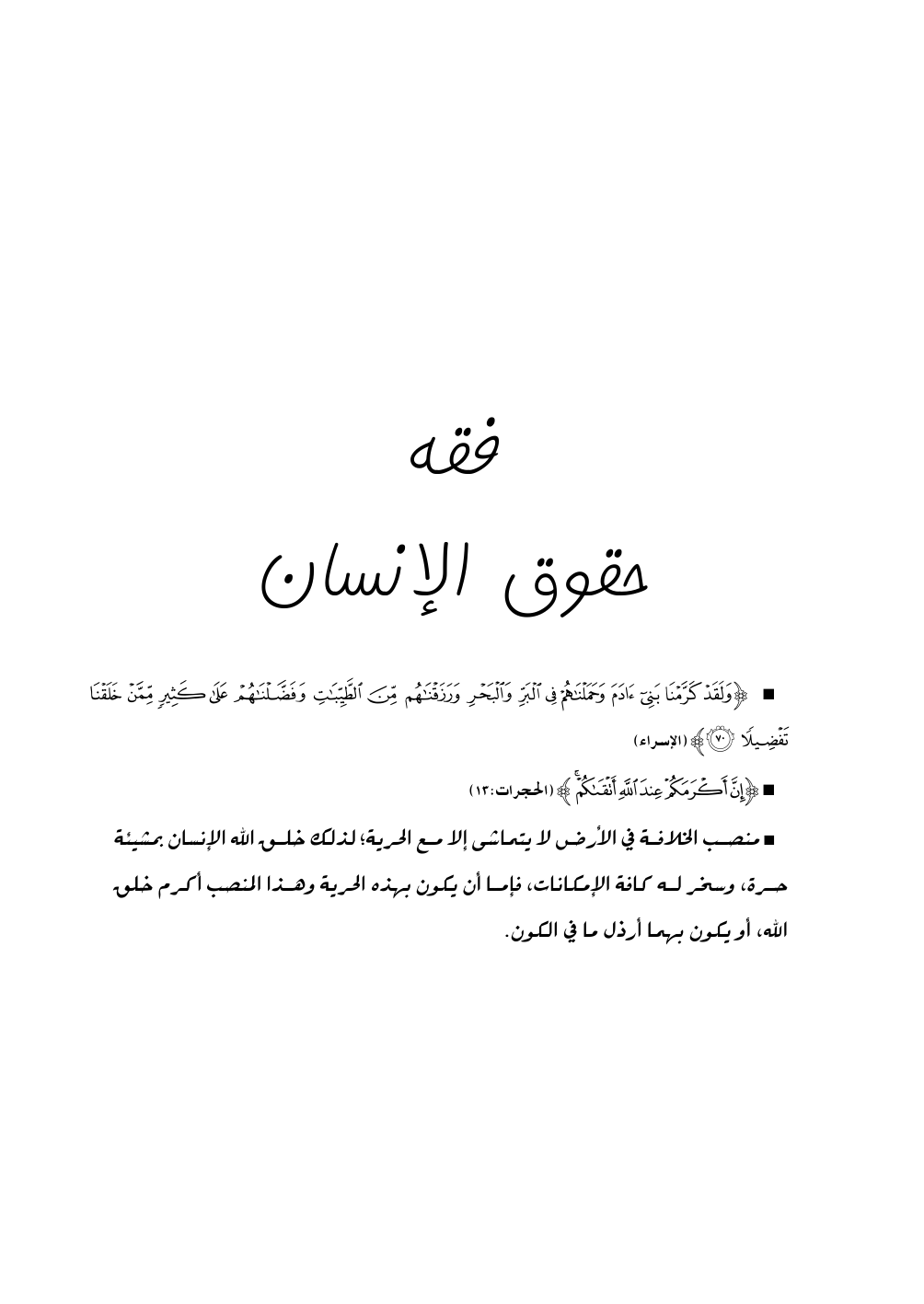 * منصب الخلافة في الأرض لا يتماشى إلا مع الحرية؛ لذلك خلق الله الإنسان بمشيئة حرة، وسخر له كافة الإمكانات، فإما أن يكون بهذه الحرية وهذا المنصب أكرم خلق الله، أو يكون بهما أرذل ما في الكون.