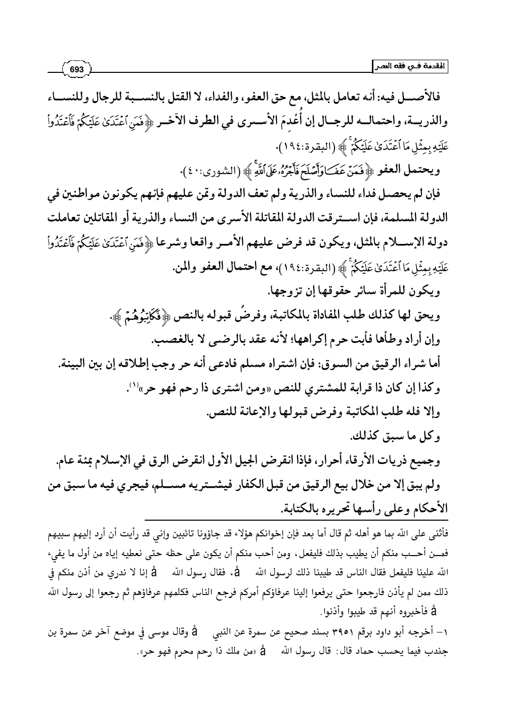 فإن لم يحصل فداء للنساء والذرية ولم تعف الدولة وتمن عليهم فإنهم يكونون مواطنين في الدولة المسلمة، فإن استرقت الدولة المقاتلة الأسرى من النساء والذرية أو المقاتلين تعاملت دولة الإسلام بالمثل، ويكون قد فرض عليهم الأمر واقعا وشرعا (فَمَنِ اعْتَدَى عَلَيْكُمْ فَاعْتَدُوا عَلَيْهِ بِمِثْلِ مَا اعْتَدَى عَلَيْكُمْ) (البقرة: 194)، مع احتمال العفو والمن.