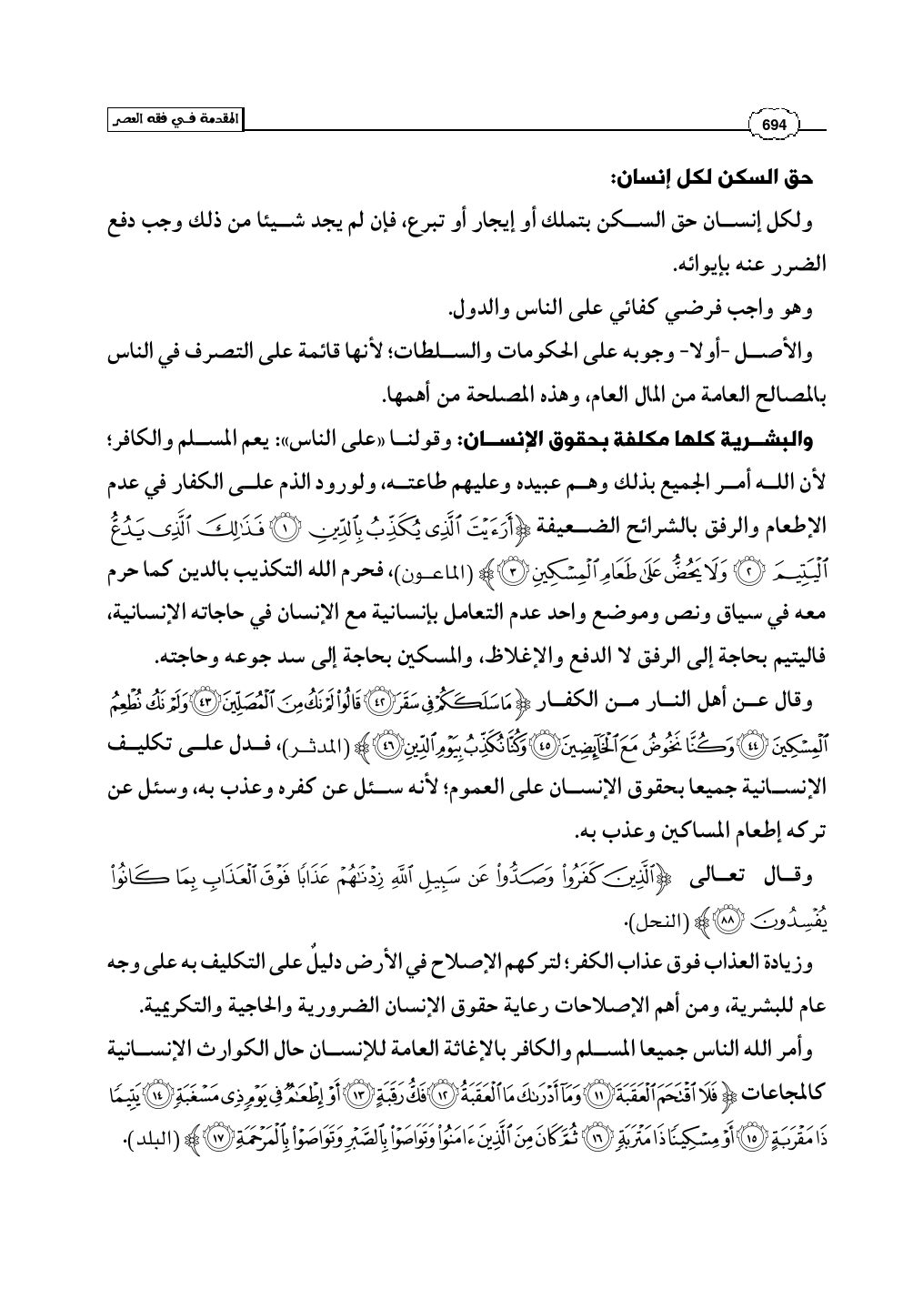 والبشرية كلها مكلفة بحقوق الإنسان: وقولنا «على الناس»: يعم المسلم والكافر؛ لأن الله أمر الجميع بذلك وهم عبيده وعليهم طاعته، ولورود الذم على الكفار في عدم الإطعام والرفق بالشرائح الضعيفة (أَرَأَيْتَ الَّذِي يُكَذِّبُ بِالدِّينِ* فَذَلِكَ الَّذِي يَدُعُّ الْيَتِيمَ* وَلا يَحُضُّ عَلَى طَعَامِ الْمِسْكِينِ) (الماعون: 1 - 3)، فحرم الله التكذيب بالدين كما حرم معه في سياق ونص وموضع واحد عدم التعامل بإنسانية مع الإنسان في حاجاته الإنسانية، فاليتيم بحاجة إلى الرفق لا الدفع والإغلاظ، والمسكين بحاجة إلى سد جوعه وحاجته.