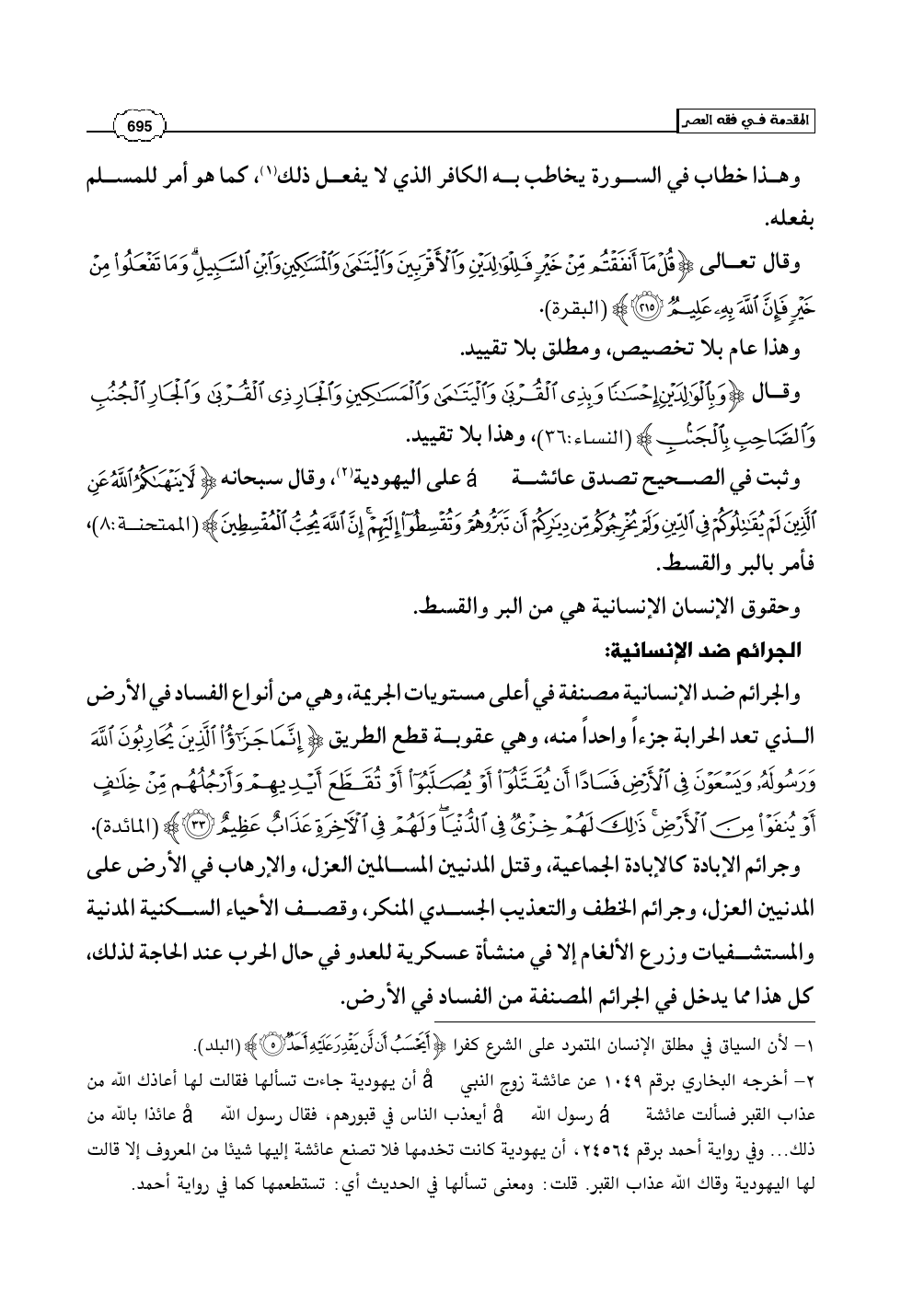 وثبت في الصحيح تصدق عائشة رضي الله عنها على اليهودية (¬2)، وقال سبحانه (لا يَنْهَاكُمُ اللَّهُ عَنِ الَّذِينَ لَمْ يُقَاتِلُوكُمْ فِي الدِّينِ وَلَمْ يُخْرِجُوكُم مِّن دِيَارِكُمْ أَن تَبَرُّوهُمْ وَتُقْسِطُوا إِلَيْهِمْ إِنَّ اللَّهَ يُحِبُّ الْمُقْسِطِينَ) (الممتحنة: 8)، فأمر بالبر والقسط.