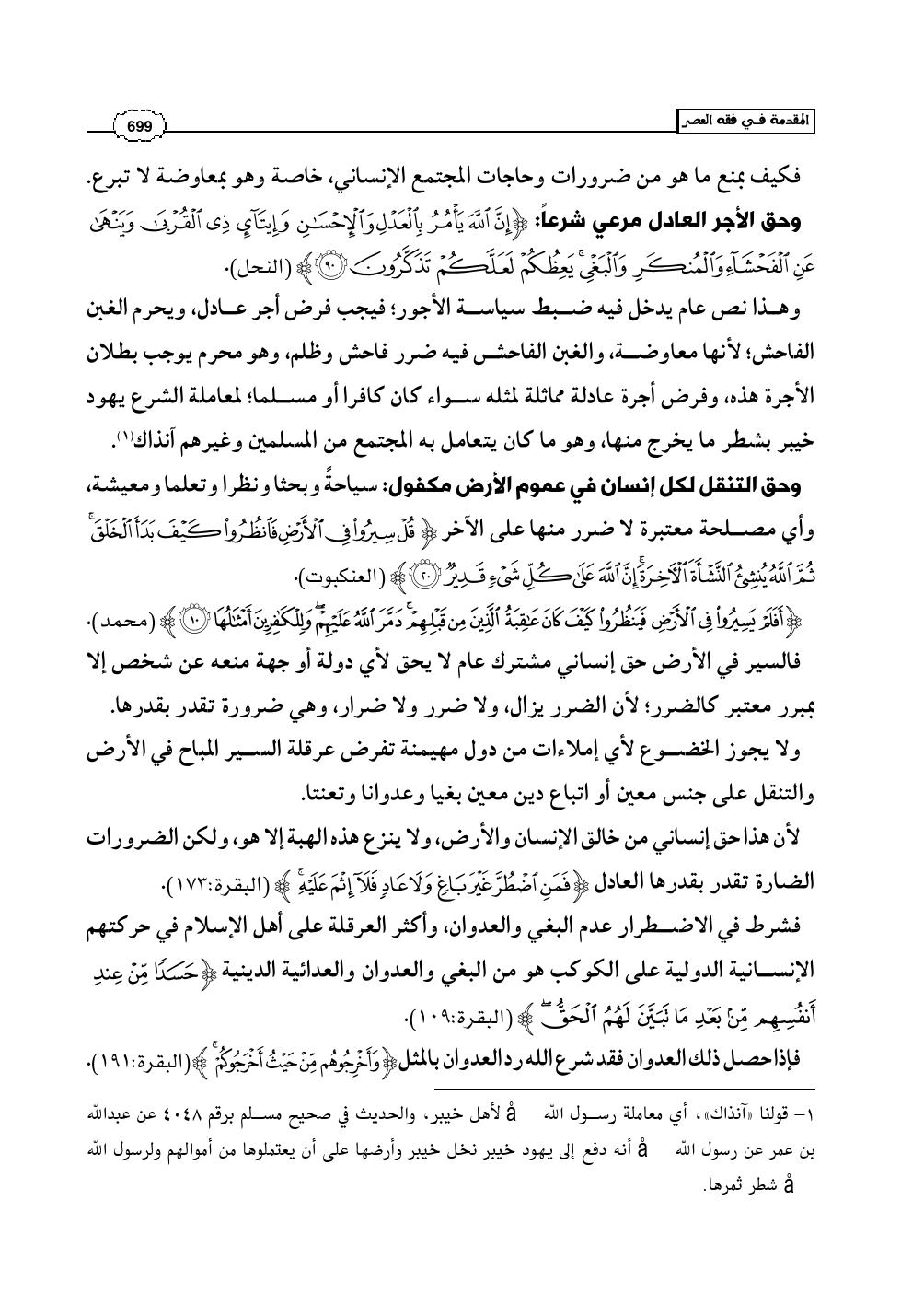 وهذا نص عام يدخل فيه ضبط سياسة الأجور؛ فيجب فرض أجر عادل، ويحرم الغبن الفاحش؛ لأنها معاوضة، والغبن الفاحش فيه ضرر فاحش وظلم، وهو محرم يوجب بطلان الأجرة هذه، وفرض أجرة عادلة مماثلة لمثله سواء كان كافرا أو مسلما؛ لمعاملة الشرع يهود خيبر بشطر ما يخرج منها، وهو ما كان يتعامل به المجتمع من المسلمين وغيرهم آنذاك (¬1).