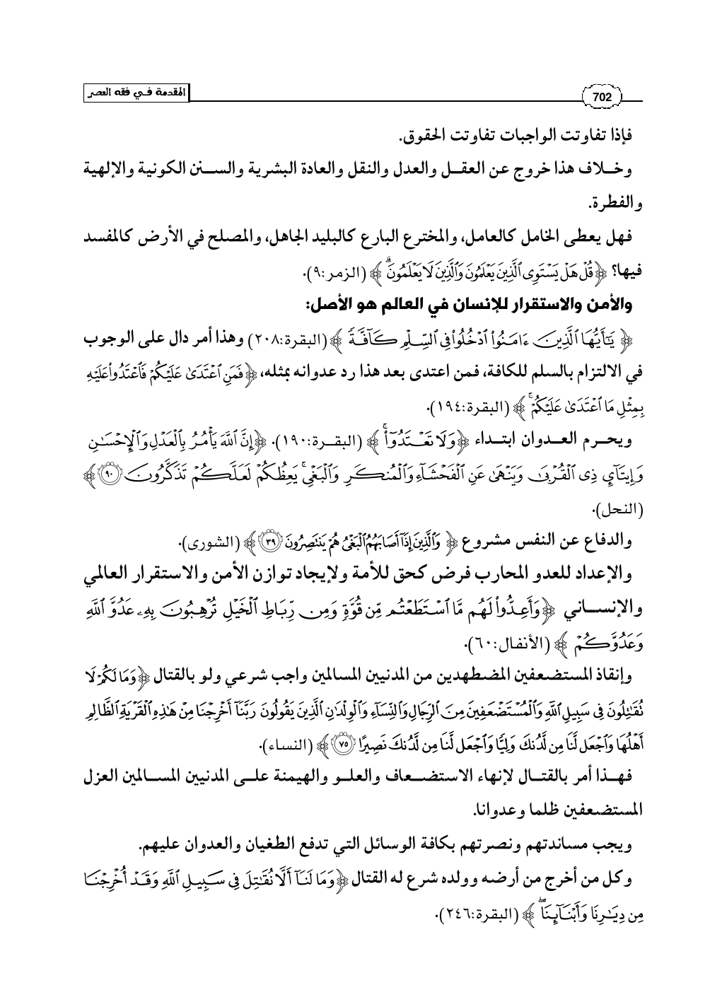 (يَا أَيُّهَا الَّذِينَ آمَنُوا ادْخُلُوا فِي السِّلْمِ كَآفَّةً) (البقرة: 208) وهذا أمر دال على الوجوب في الالتزام بالسلم للكافة، فمن اعتدى بعد هذا رد عدوانه بمثله، (فَمَنِ اعْتَدَى عَلَيْكُمْ فَاعْتَدُوا عَلَيْهِ بِمِثْلِ مَا اعْتَدَى عَلَيْكُمْ) (البقرة: 194).