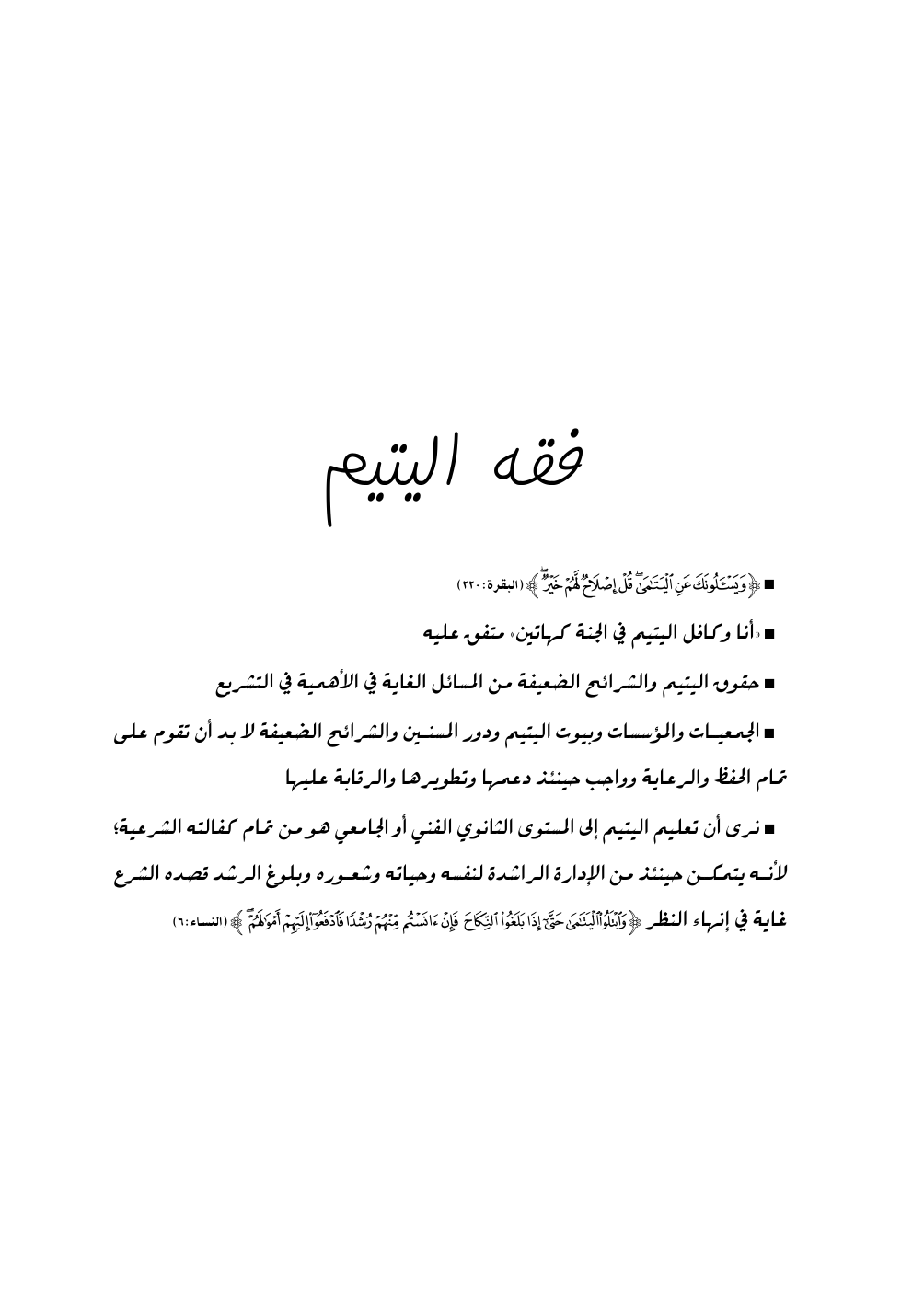 * نرى أن تعليم اليتيم إلى المستوى الثانوي الفني أو الجامعي هو من تمام كفالته الشرعية؛ لأنه يتمكن حينئذ من الإدارة الراشدة لنفسه وحياته وشعوره وبلوغ الرشد قصده الشرع غاية في إنهاء النظر (وَابْتَلُوا الْيَتَامَى حَتَّىَ إِذَا بَلَغُوا النِّكَاحَ فَإِنْ آنَسْتُم مِّنْهُمْ رُشْدًا فَادْفَعُوا إِلَيْهِمْ أَمْوَالَهُمْ) (النساء: 6)