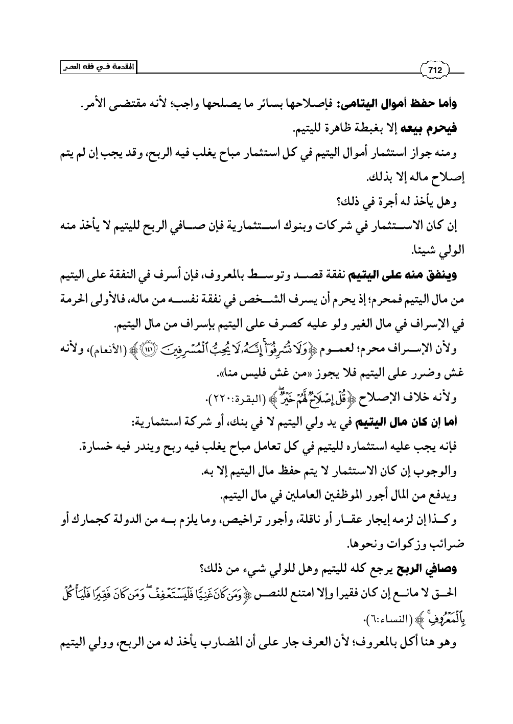 ومنه جواز استثمار أموال اليتيم في كل استثمار مباح يغلب فيه الربح، وقد يجب إن لم يتم إصلاح ماله إلا بذلك.