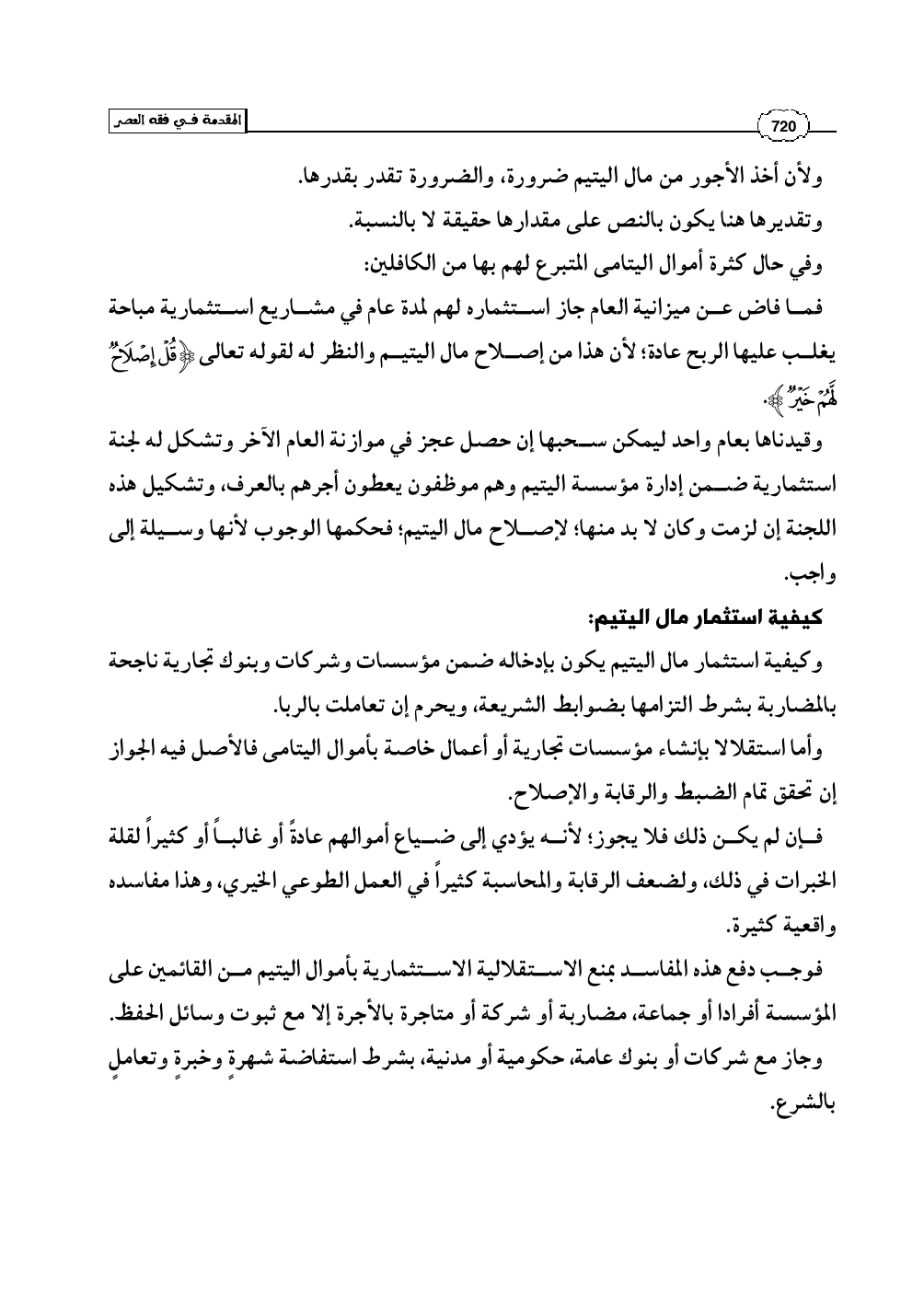 وقيدناها بعام واحد ليمكن سحبها إن حصل عجز في موازنة العام الآخر وتشكل له لجنة استثمارية ضمن إدارة مؤسسة اليتيم وهم موظفون يعطون أجرهم بالعرف، وتشكيل هذه اللجنة إن لزمت وكان لا بد منها؛ لإصلاح مال اليتيم؛ فحكمها الوجوب لأنها وسيلة إلى واجب.