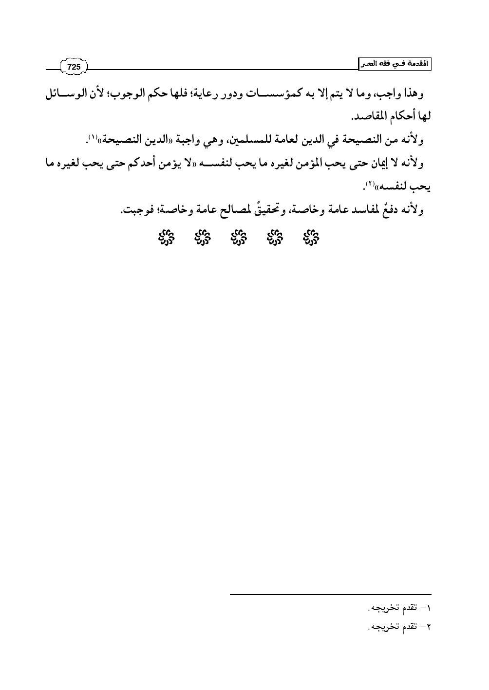 ولأنه من النصيحة في الدين لعامة للمسلمين، وهي واجبة «الدين النصيحة» (¬1).