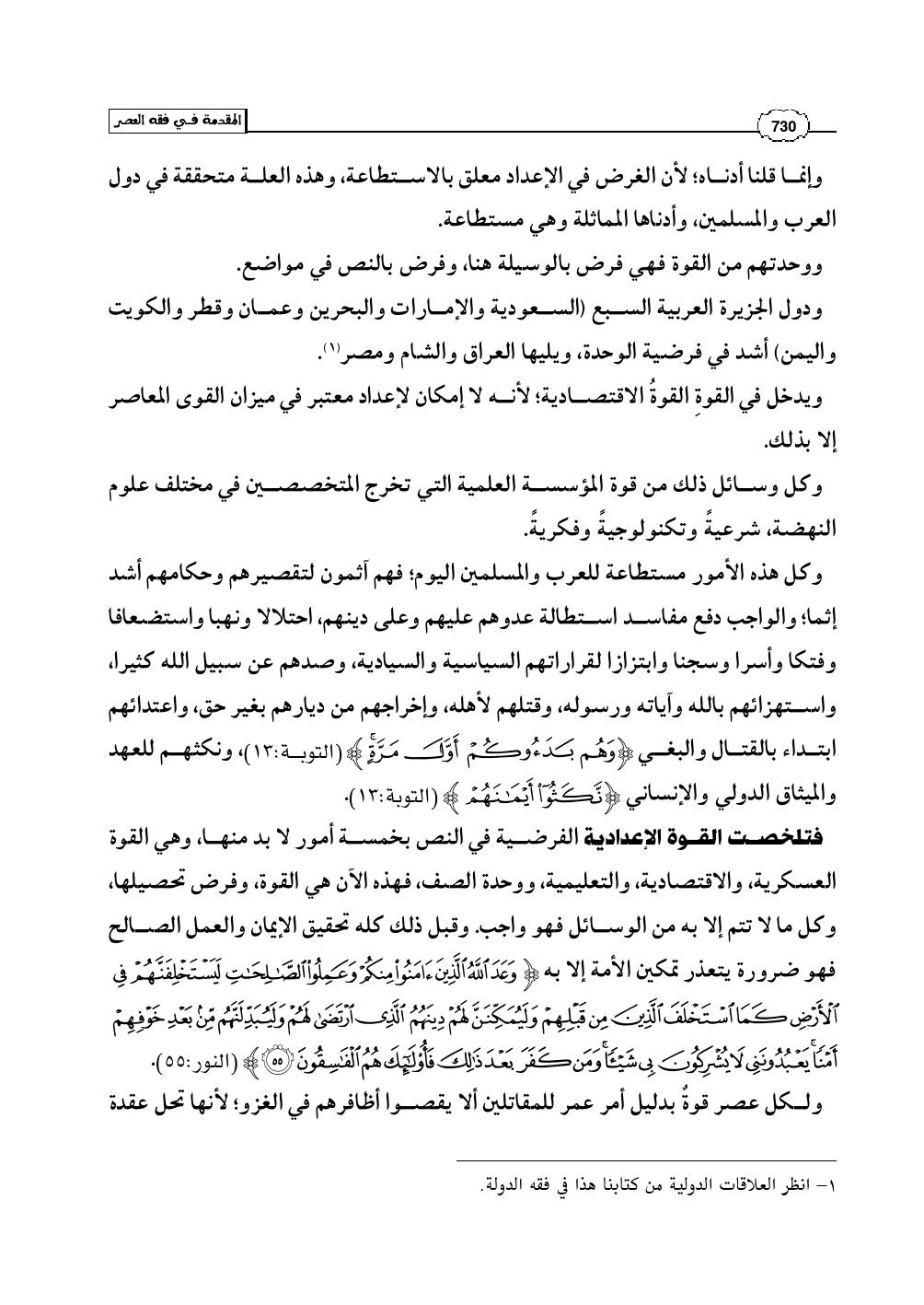 فتلخصت القوة الإعدادية الفرضية في النص بخمسة أمور لا بد منها، وهي القوة العسكرية، والاقتصادية، والتعليمية، ووحدة الصف، فهذه الآن هي القوة، وفرض تحصيلها، وكل ما لا تتم إلا به من الوسائل فهو واجب. وقبل ذلك كله تحقيق الإيمان والعمل الصالح فهو ضرورة يتعذر تمكين الأمة إلا به (وَعَدَ اللَّهُ الَّذِينَ آمَنُوا مِنكُمْ وَعَمِلُوا الصَّالِحَاتِ لَيَسْتَخْلِفَنَّهُم فِي الأَرْضِ كَمَا اسْتَخْلَفَ الَّذِينَ مِن قَبْلِهِمْ وَلَيُمَكِّنَنَّ لَهُمْ دِينَهُمُ الَّذِي ارْتَضَى لَهُمْ وَلَيُبَدِّلَنَّهُم مِّن بَعْدِ خَوْفِهِمْ أَمْنًا يَعْبُدُونَنِي لا يُشْرِكُونَ بِي شَيْئًا وَمَن كَفَرَ بَعْدَ ذَلِكَ فَأُوْلَئِكَ هُمُ الْفَاسِقُونَ) (النور: 55).