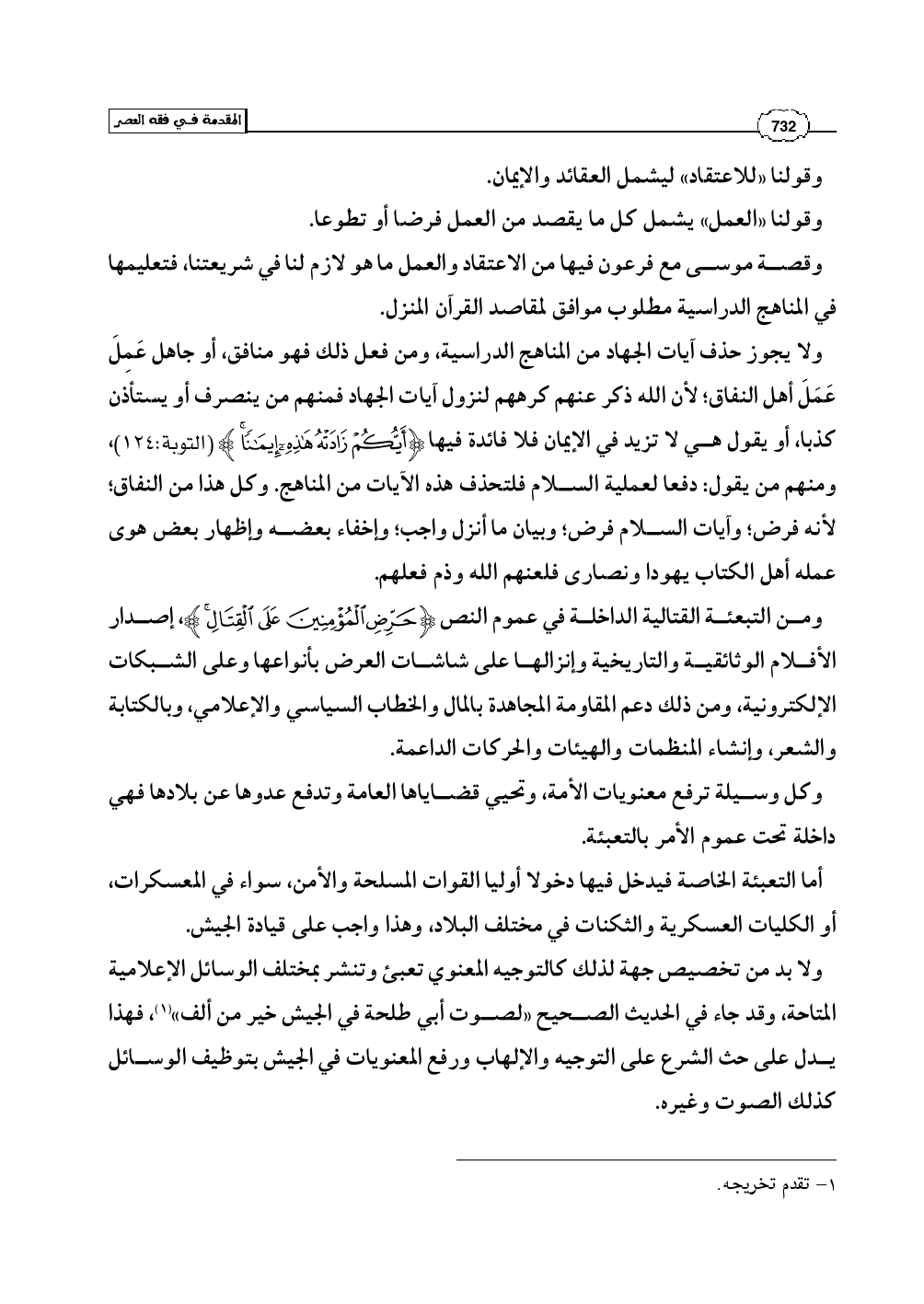ولا يجوز حذف آيات الجهاد من المناهج الدراسية، ومن فعل ذلك فهو منافق، أو جاهل عَمِلَ عَمَلَ أهل النفاق؛ لأن الله ذكر عنهم كرههم لنزول آيات الجهاد فمنهم من ينصرف أو يستأذن كذبا، أو يقول هي لا تزيد في الإيمان فلا فائدة فيها (أَيُّكُمْ زَادَتْهُ هَذِهِ إِيمَانًا) (التوبة: 124)، ومنهم من يقول: دفعا لعملية السلام فلتحذف هذه الآيات من المناهج. وكل هذا من النفاق؛ لأنه فرض؛ وآيات السلام فرض؛ وبيان ما أنزل واجب؛ وإخفاء بعضه وإظهار بعض هوى عمله أهل الكتاب يهودا ونصارى فلعنهم الله وذم فعلهم.
