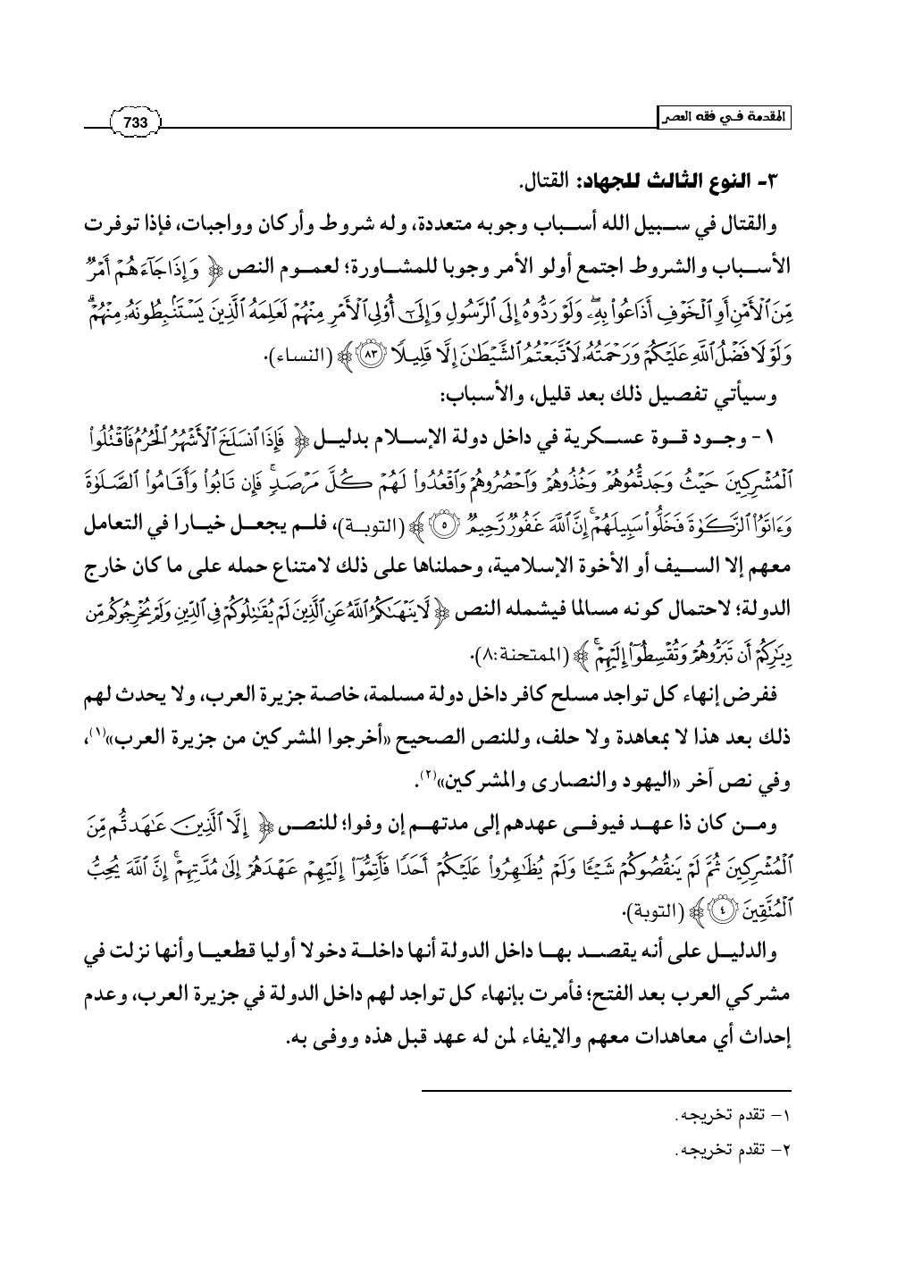 ففرض إنهاء كل تواجد مسلح كافر داخل دولة مسلمة، خاصة جزيرة العرب، ولا يحدث لهم ذلك بعد هذا لا بمعاهدة ولا حلف، وللنص الصحيح «أخرجوا المشركين من جزيرة العرب» (¬1)، وفي نص آخر «اليهود والنصارى والمشركين» (¬2).