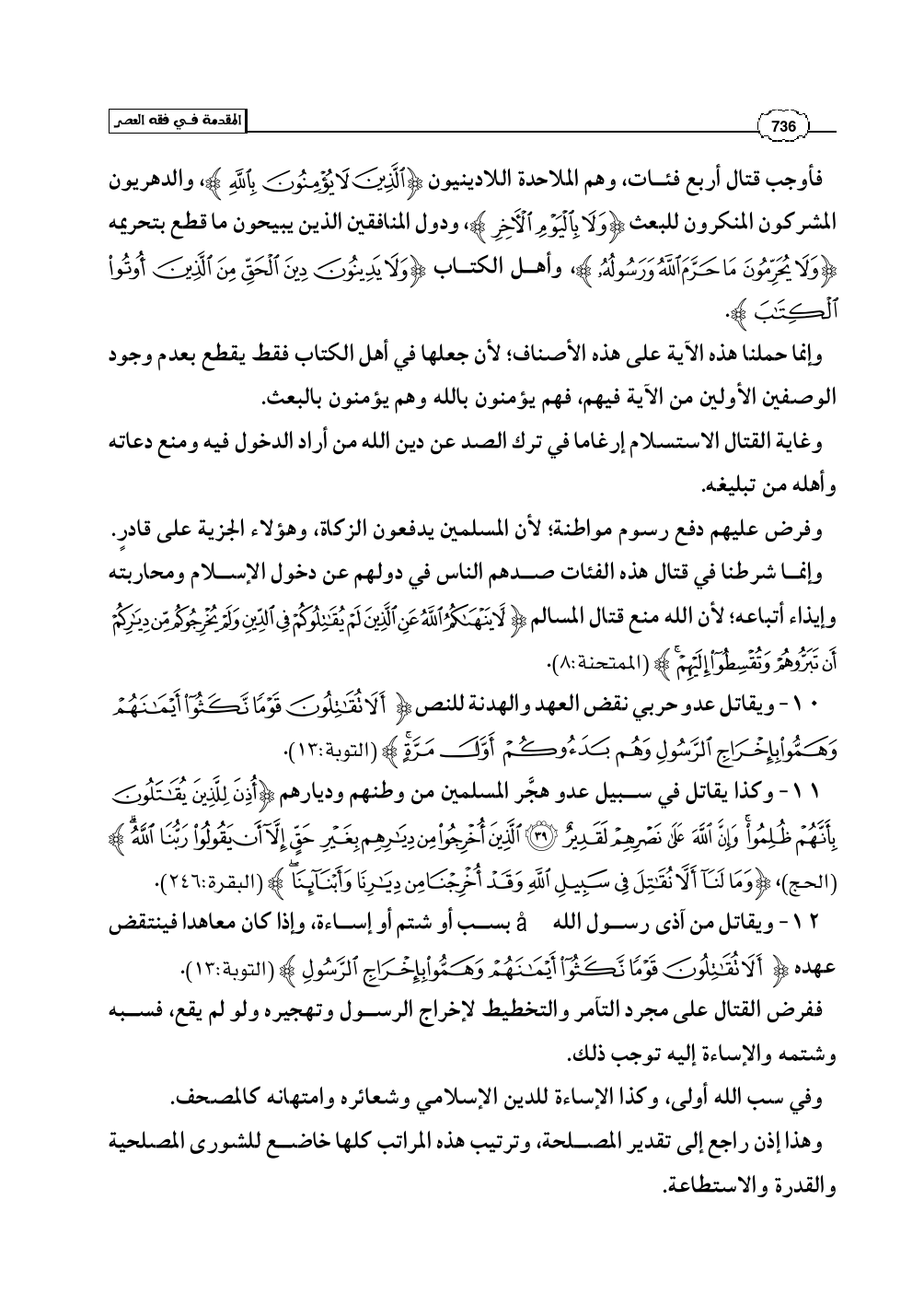 فأوجب قتال أربع فئات، وهم الملاحدة اللادينيون (الَّذِينَ لاَ يُؤْمِنُونَ بِاللَّهِ)، والدهريون المشركون المنكرون للبعث (وَلاَ بِالْيَوْمِ الآخِرِ)، ودول المنافقين الذين يبيحون ما قطع بتحريمه (وَلاَ يُحَرِّمُونَ مَا حَرَّمَ اللَّهُ وَرَسُولُهُ)، وأهل الكتاب (وَلاَ يَدِينُونَ دِينَ الْحَقِّ مِنَ الَّذِينَ أُوتُوا الْكِتَابَ).