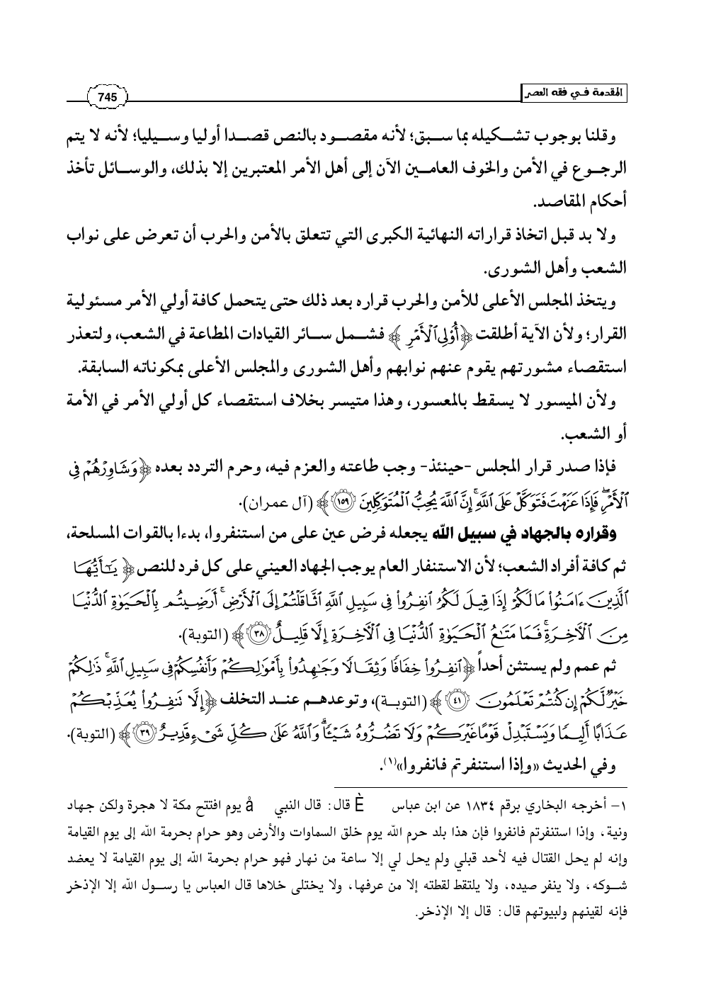 ويتخذ المجلس الأعلى للأمن والحرب قراره بعد ذلك حتى يتحمل كافة أولي الأمر مسئولية القرار؛ ولأن الآية أطلقت (أُوْلِي الأَمْرِ) فشمل سائر القيادات المطاعة في الشعب، ولتعذر استقصاء مشورتهم يقوم عنهم نوابهم وأهل الشورى والمجلس الأعلى بمكوناته السابقة.