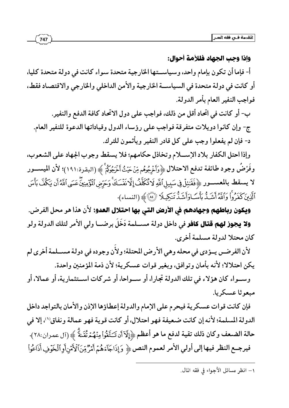 ج- وإن كانوا دويلات متفرقة فواجب على رؤساء الدول وقياداتها الدعوة للنفير العام.
