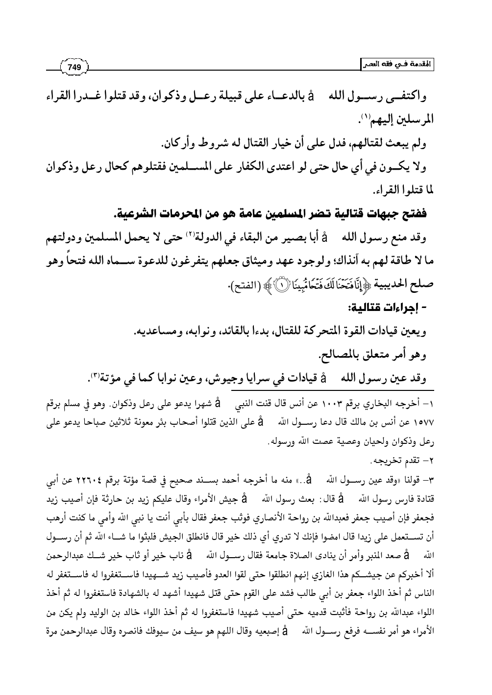 (¬3) - قولنا «وقد عين رسول الله صلى الله عليه وسلم .. » منه ما أخرجه أحمد بسند صحيح في قصة مؤتة برقم 22604 عن أبي قتادة فارس رسول الله صلى الله عليه وسلم قال: بعث رسول الله صلى الله عليه وسلم جيش الأمراء وقال عليكم زيد بن حارثة فإن أصيب زيد فجعفر فإن أصيب جعفر فعبدالله بن رواحة الأنصاري فوثب جعفر فقال بأبي أنت يا نبي الله وأمي ما كنت أرهب أن تستعمل على زيدا قال امضوا فإنك لا تدري أي ذلك خير قال فانطلق الجيش فلبثوا ما شاء الله ثم أن رسول الله صلى الله عليه وسلم صعد المنبر وأمر أن ينادى الصلاة جامعة فقال رسول الله صلى الله عليه وسلم ناب خير أو ثاب خير شك عبدالرحمن ألا أخبركم عن جيشكم هذا الغازي إنهم انطلقوا حتى لقوا العدو فأصيب زيد شهيدا فاستغفروا له فاستغفر له الناس ثم أخذ اللواء جعفر بن أبي طالب فشد على القوم حتى قتل شهيدا أشهد له بالشهادة فاستغفروا له ثم أخذ اللواء عبدالله بن رواحة فأثبت قدميه حتى أصيب شهيدا فاستغفروا له ثم أخذ اللواء خالد بن الوليد ولم يكن من الأمراء هو أمر نفسه فرفع رسول الله صلى الله عليه وسلم إصبعيه وقال اللهم هو سيف من سيوفك فانصره وقال عبدالرحمن مرة فانتصر به فيومئذ سمي خالد سيف الله ثم قال النبي صلى الله عليه وسلم انفروا فأمدوا إخوانكم ولا يتخلفن أحد فنفر الناس في حر شديد مشاة وركبانا.