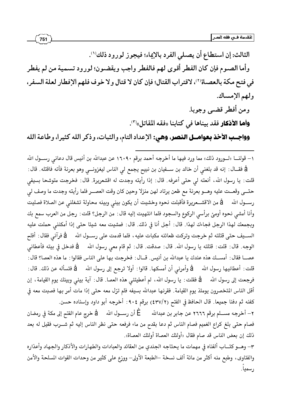 (¬1) - قولنا «لورود ذلك» مما ورد فيها ما أخرجه أحمد برقم 16090 عن عبدالله بن أنيس قال دعاني رسول الله صلى الله عليه وسلم فقال: إنه قد بلغني أن خالد بن سفيان بن نبيح يجمع لي الناس ليغزوني وهو بعرنة فأته فاقتله. قال: قلت: يا رسول الله، أنعته لي حتى أعرفه. قال: إذا رأيته وجدت له اقشعريرة. قال: فخرجت متوشحا بسيفي حتى وقعت عليه وهو بعرنة مع ظعن يرتاد لهن منزلا وحين كان وقت العصر فلما رأيته وجدت ما وصف لي رسول الله صلى الله عليه وسلم من الاقشعريرة فأقبلت نحوه وخشيت أن يكون بيني وبينه محاولة تشغلني عن الصلاة فصليت وأنا أمشي نحوه أومئ برأسي الركوع والسجود فلما انتهيت إليه قال: من الرجل؟ قلت: رجل من العرب سمع بك وبجمعك لهذا الرجل فجاءك لهذا. قال: أجل أنا في ذلك. قال: فمشيت معه شيئا حتى إذا أمكنني حملت عليه السيف حتى قتلته ثم خرجت وتركت ظعائنه مكبات عليه، فلما قدمت على رسول الله صلى الله عليه وسلم فرآني فقال: أفلح الوجه. قال: قلت: قتلته يا رسول الله. قال: صدقت. قال: ثم قام معي رسول الله صلى الله عليه وسلم فدخل في بيته فأعطاني عصا فقال: أمسك هذه عندك يا عبدالله بن أنيس. قال: فخرجت بها على الناس فقالوا: ما هذه العصا؟ قال: قلت: أعطانيها رسول الله صلى الله عليه وسلم وأمرني أن أمسكها. قالوا: أولا ترجع إلى رسول الله صلى الله عليه وسلم فتسأله عن ذلك. قال: فرجعت إلى رسول الله صلى الله عليه وسلم فقلت: يا رسول الله، لم أعطيتني هذه العصا. قال: آية بيني وبينك يوم القيامة، إن أقل الناس المتخصرون يومئذ يوم القيامة. فقرنها عبدالله بسيفه فلم تزل معه حتى إذا مات أمر بها فصبت معه في كفنه ثم دفنا جميعا. قال الحافظ في الفتح (2/ 437) برقم 904: أخرجه أبو داود وإسناده حسن.