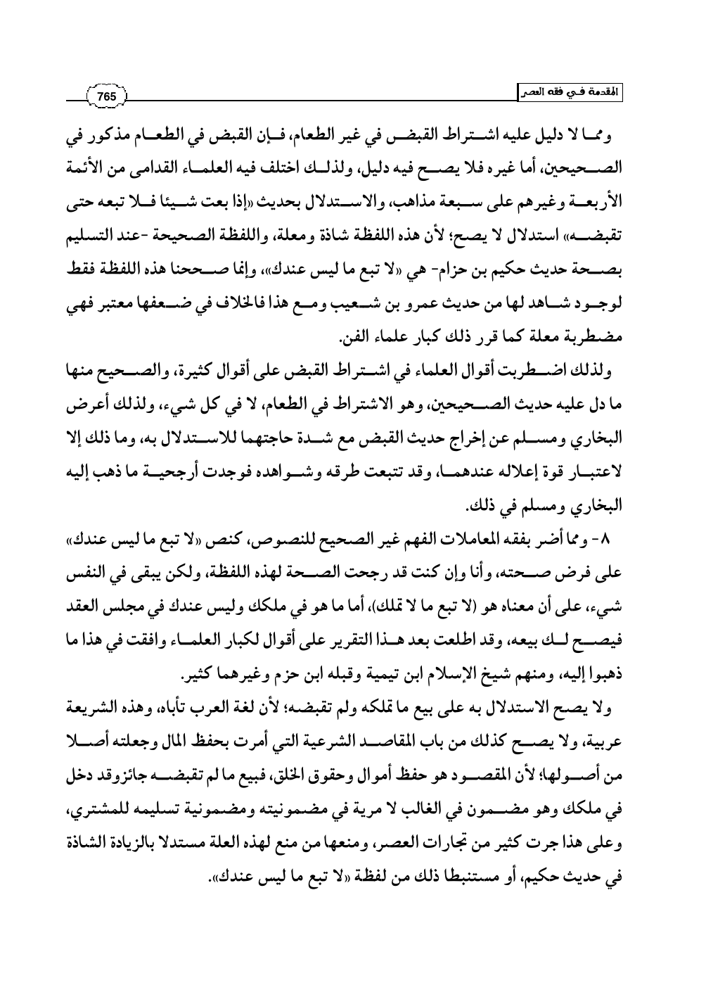 8 - ومما أضر بفقه المعاملات الفهم غير الصحيح للنصوص، كنص «لا تبع ما ليس عندك» على فرض صحته، وأنا وإن كنت قد رجحت الصحة لهذه اللفظة، ولكن يبقى في النفس شيء، على أن معناه هو (لا تبع ما لا تملك)، أما ما هو في ملكك وليس عندك في مجلس العقد فيصح لك بيعه، وقد اطلعت بعد هذا التقرير على أقوال لكبار العلماء وافقت في هذا ما ذهبوا إليه، ومنهم شيخ الإسلام ابن تيمية وقبله ابن حزم وغيرهما كثير.