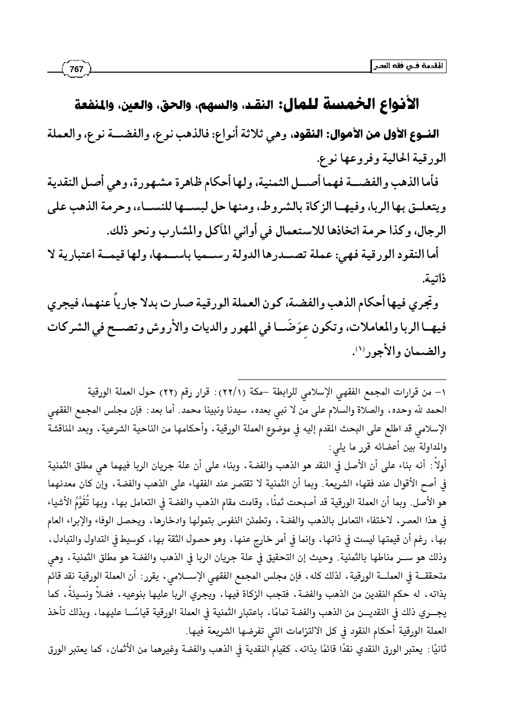 النوع الأول من الأموال: النقود، وهي ثلاثة أنواع: فالذهب نوع، والفضة نوع، والعملة الورقية الحالية وفروعها نوع.