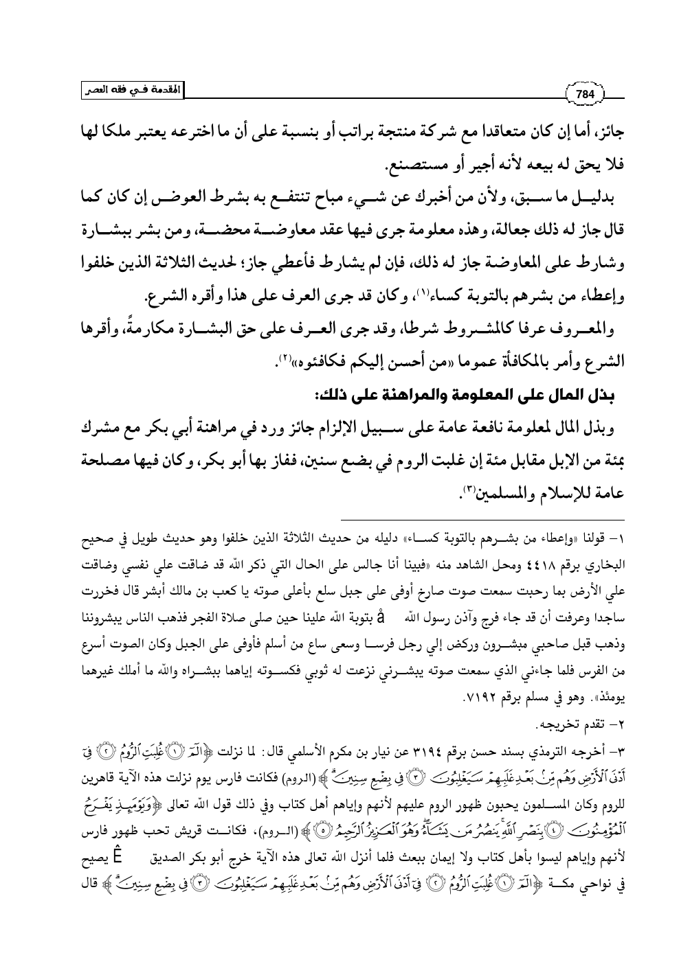 وبذل المال لمعلومة نافعة عامة على سبيل الإلزام جائز ورد في مراهنة أبي بكر مع مشرك بمئة من الإبل مقابل مئة إن غلبت الروم في بضع سنين، ففاز بها أبو بكر، وكان فيها مصلحة عامة للإسلام والمسلمين (¬3).